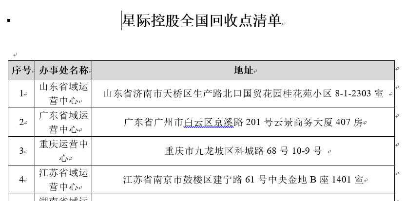 产品全国回收点公示