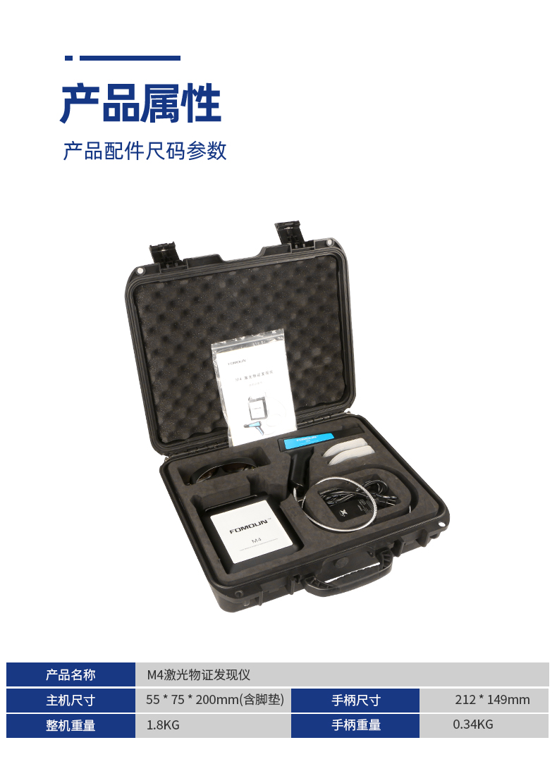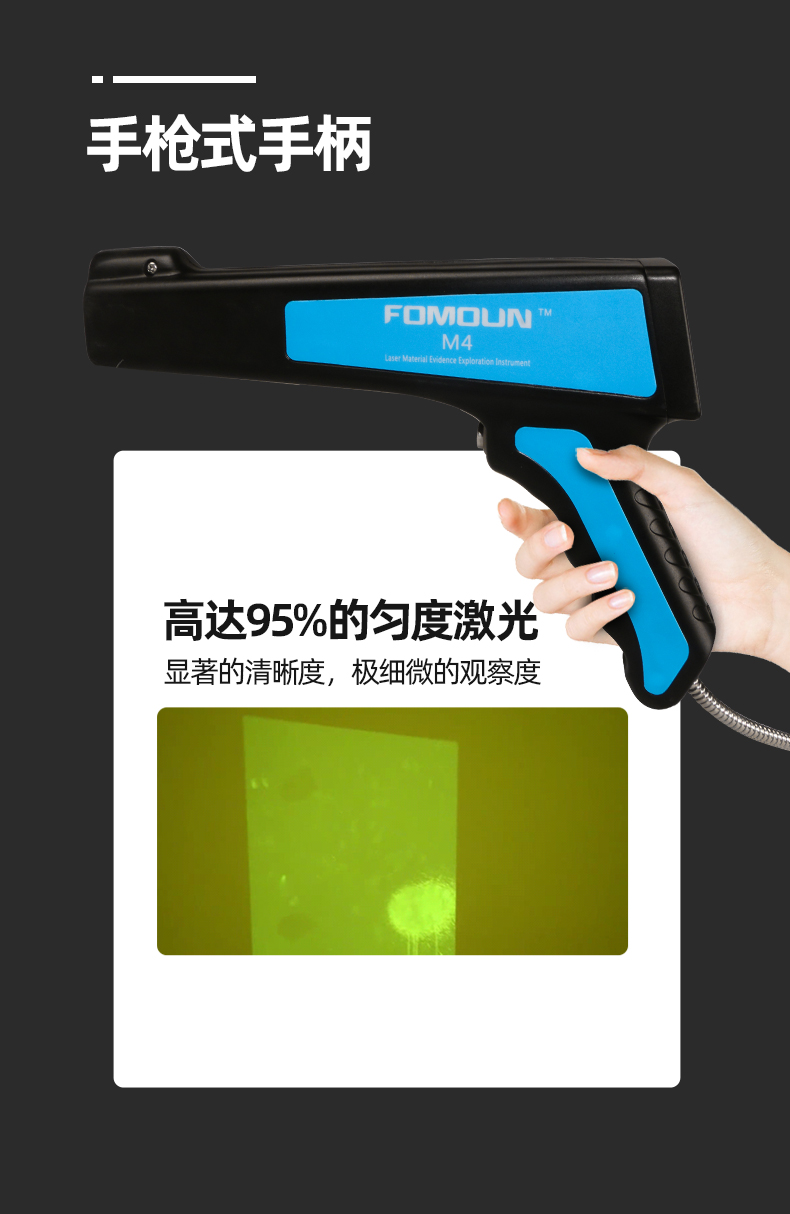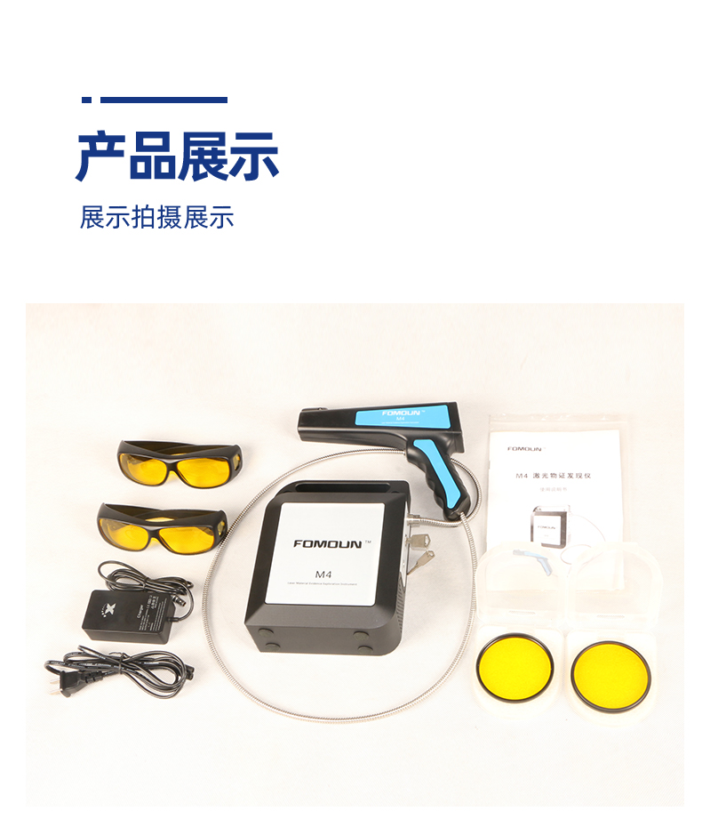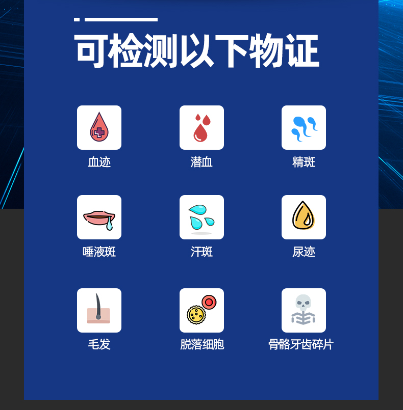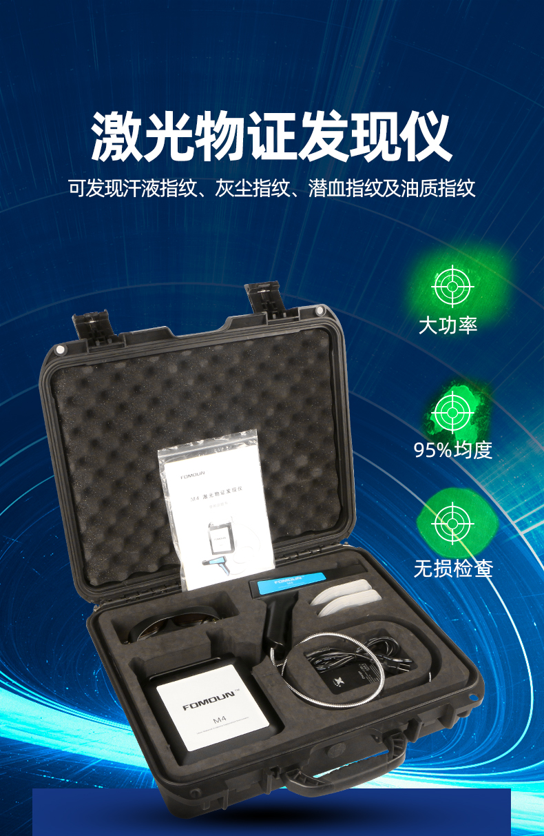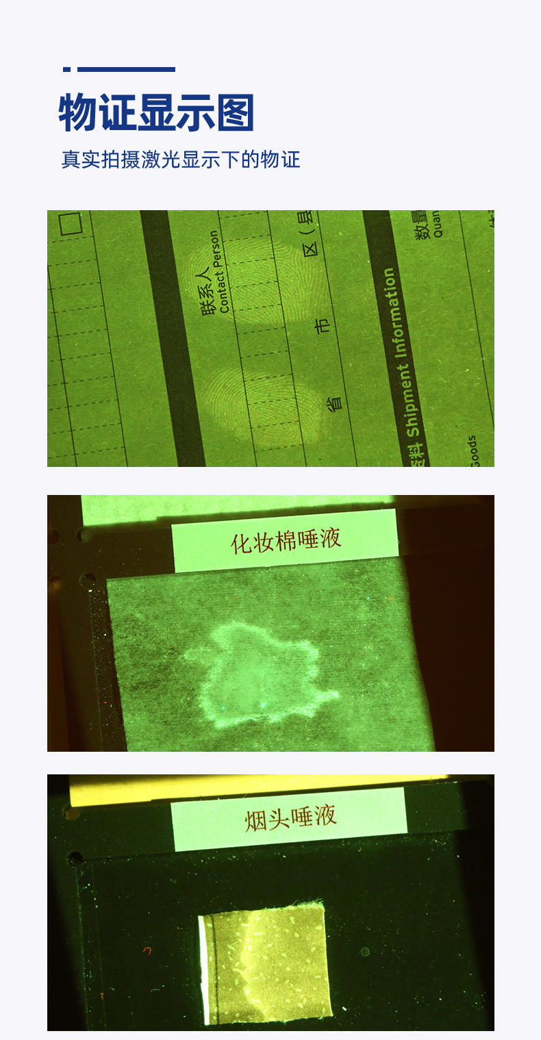 该产品以无损方式勘查各种物证及痕迹,对汗液指纹、灰尘指纹、潜血指纹及油质指纹等具有直接发现功能,直接获取原始真实信息;对生物活性成分具有超强发现功能且无破坏,如血迹、潜血、精斑、唾液斑、汗斑、尿迹、毛发、脱落细胞、骨骼牙齿碎片等,保证物证客体信息的真实性,完整性及生物活性,其勘查能力远优于其他光源。