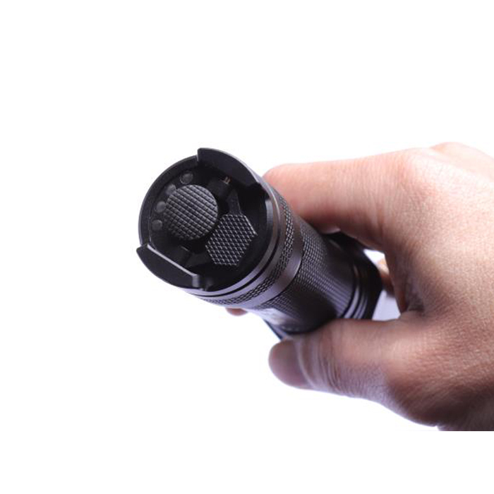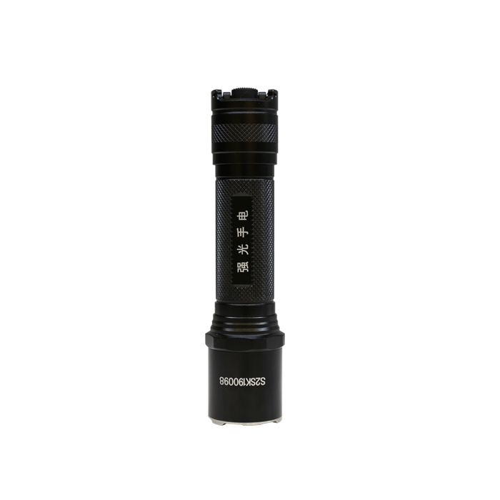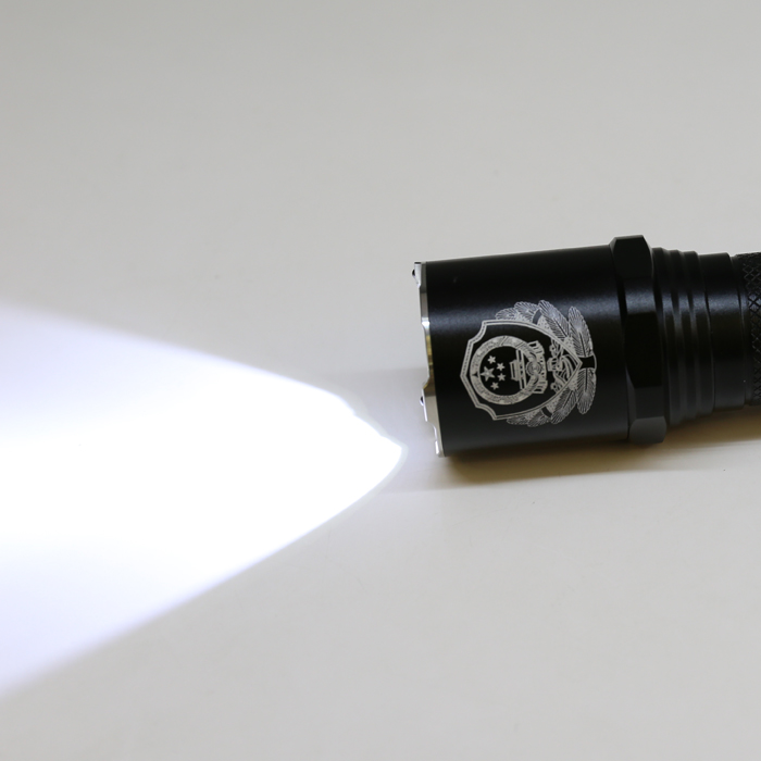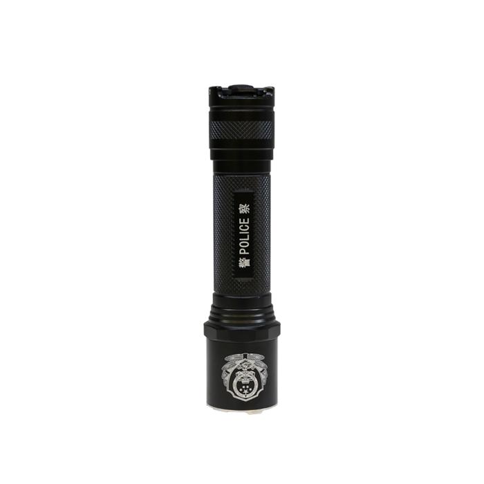 警用强光手电为防滚动圆柱形结构,由六角攻击头盖、照明单元、握柄(包括开关组件、隐藏式USB充电接口、4格电池电量显示装置)、电池、尾盖及挂绳组成,战术型的按键后置,配合手枪使用。开关按钮区域有长亮键和爆闪键。