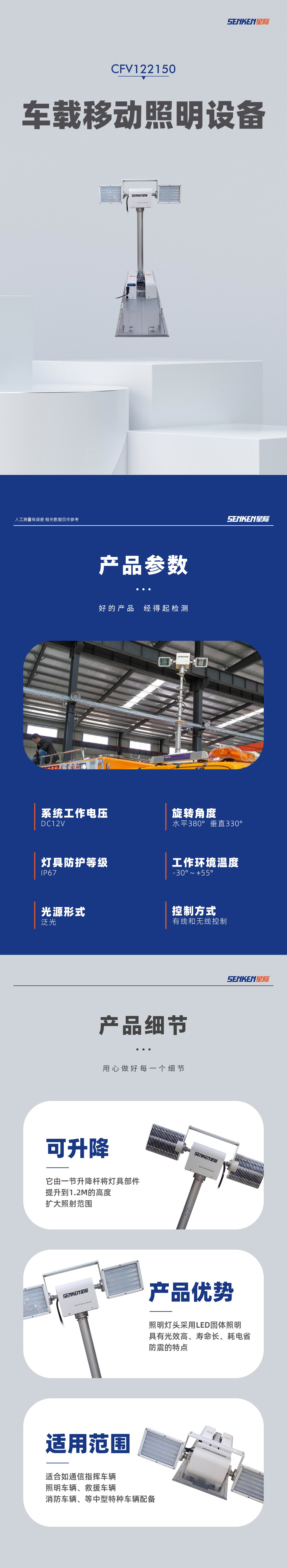 车载移动照明设备是升降气杆升起时,高度为1.2m的照明设备系列。适合如通信指挥车辆、照明车辆、救援车辆、消防车辆、等中型特种车辆配备。照明灯头采用LED固体照明具有光效高、寿命长、耗电省、防震的特点。