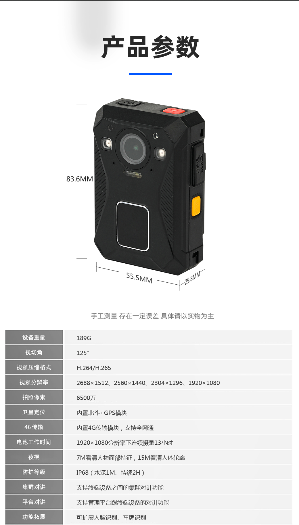 4G执法仪是执法工作人员随身佩戴的,具有音视频记录功能的信息终端;设备支持录像、录音、抓图、3G/4G网络传输、GPS+北斗定位;设备操作简洁,重量轻,体积小,携带方便,主要应用于公安民警办案,交警执法,消防检查,城管执法,烟草执法等需要记录执法过程的场合。