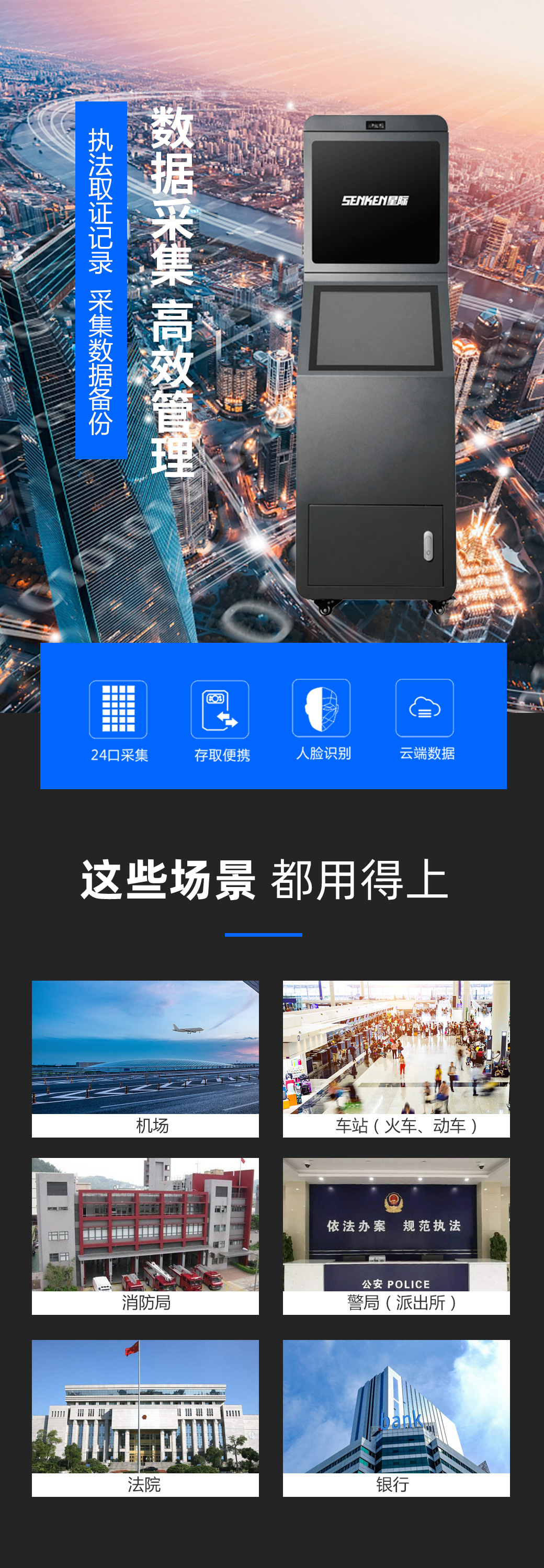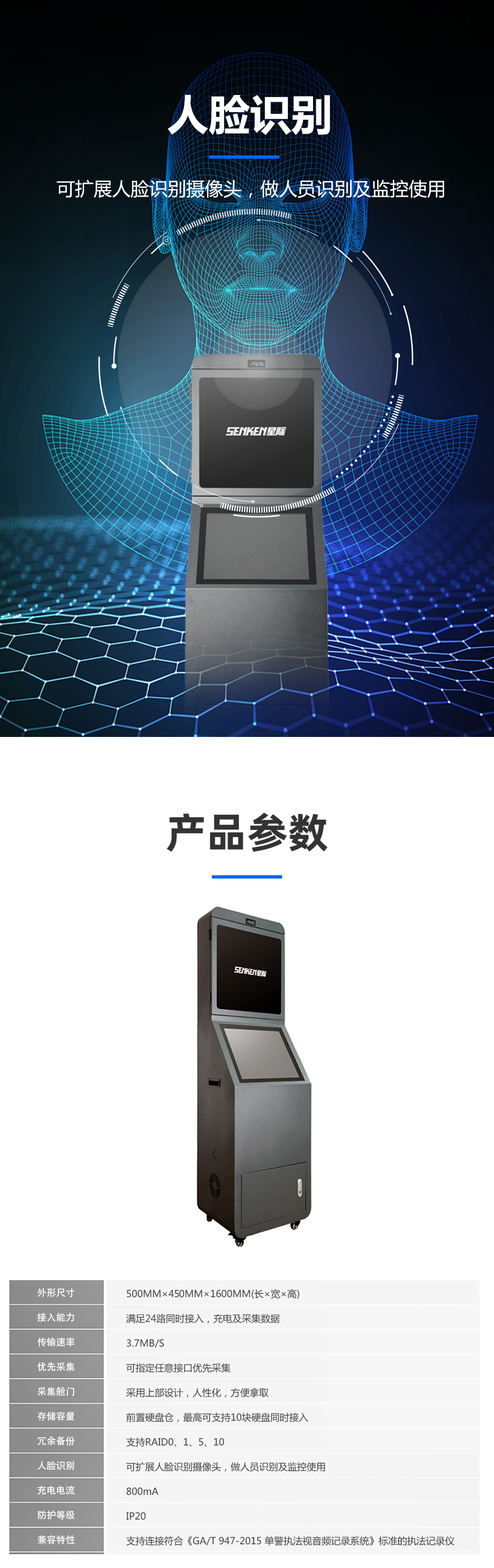 立式采集工作站,通过USB3.0 HUB来扩展USB接口,满足24路同时接入能力要求,保证数据传输的稳定性;为保证执法数据采集设备的数据存储的安全性和上传速率,选用监控级硬盘,平均单路上传速率>8MB/s。广泛应用于公安,交警,城管、路政等部门,为进一步促进规范执法提供了有力保障。