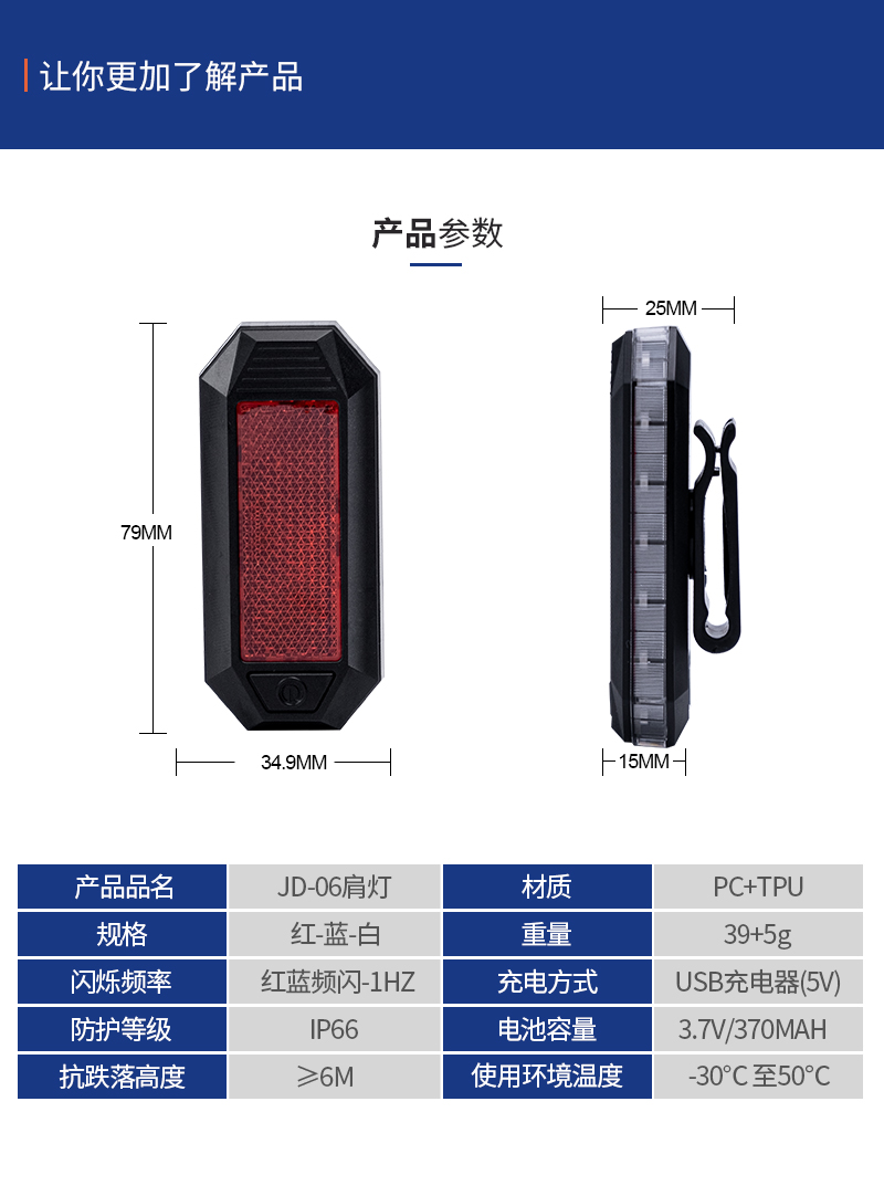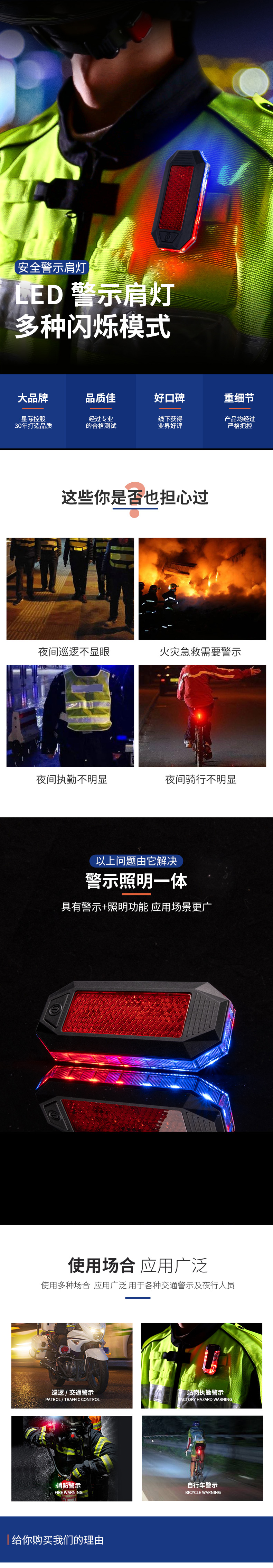 单警执勤警示肩灯用于交警、路政、环卫、城管等部门工作和执法人员,在夜间上路佩戴,既能远距离的警示驾驶员、行人遵守交通规则,又能有效显示佩戴人员的位置,保护执勤人员的自身安全。使用范围:消防、公安、交警以及市政、救护、抢险等工作人员作为信号联系和方位显示,各种特殊危险场所,易燃易爆场所。