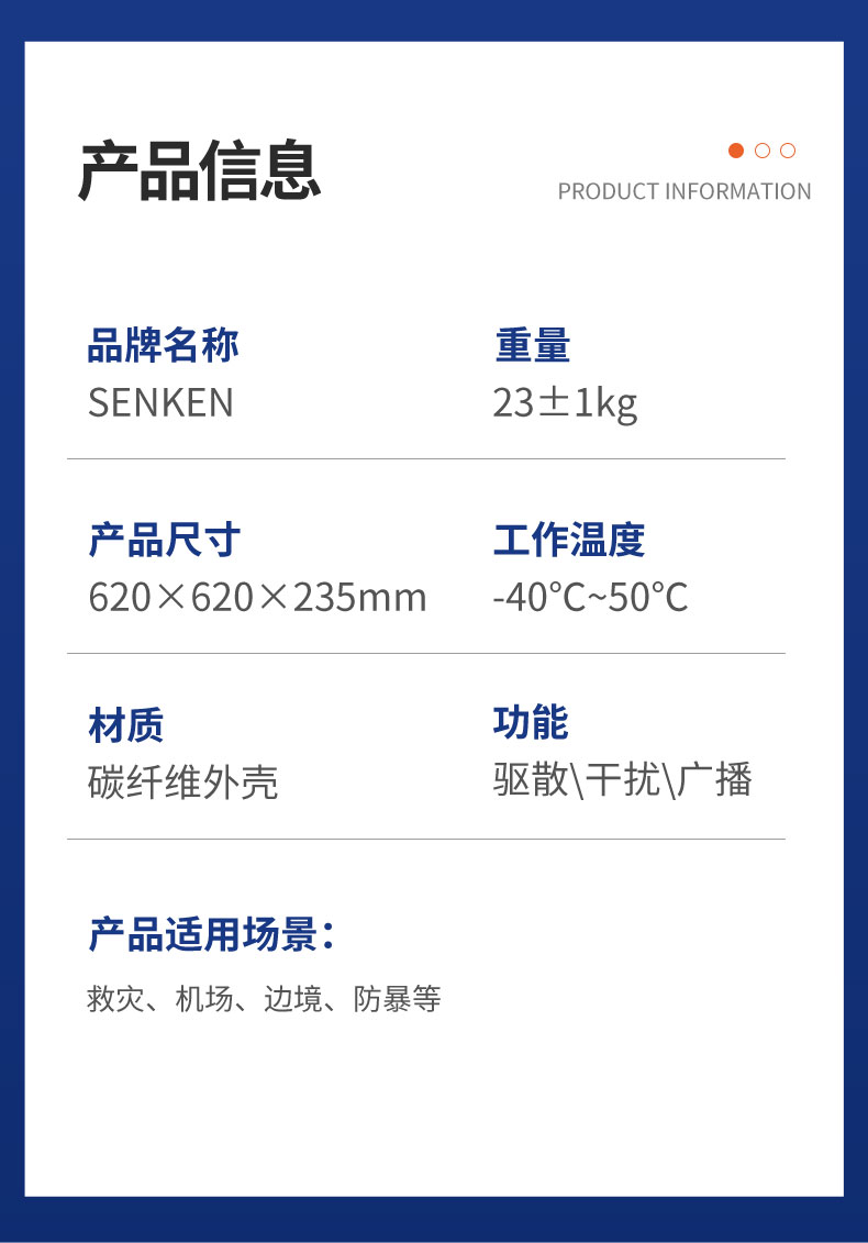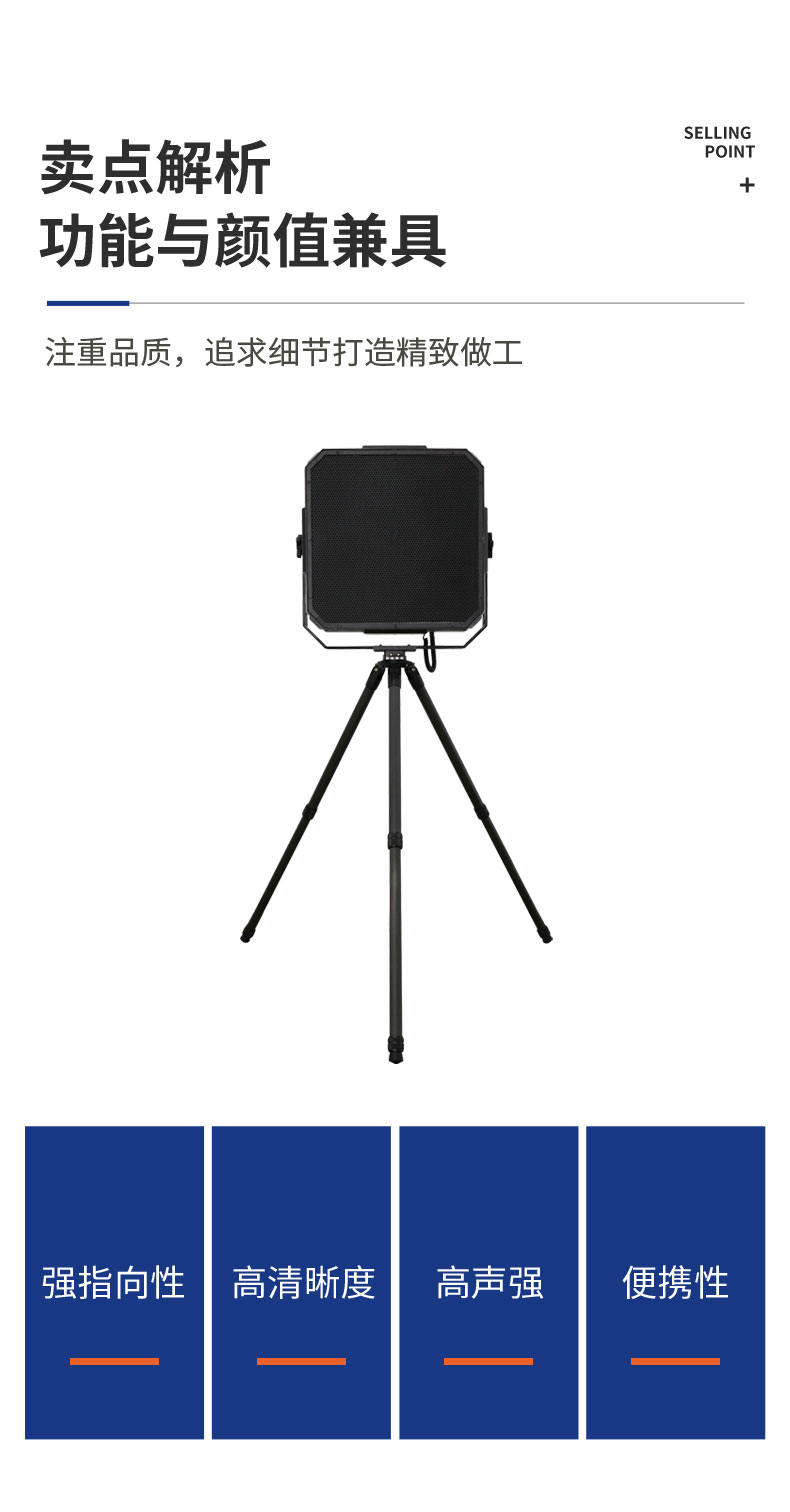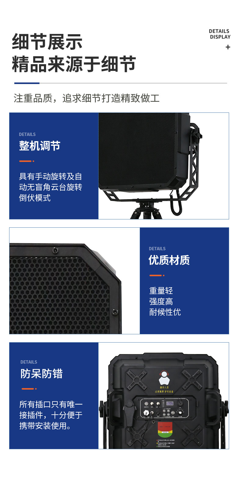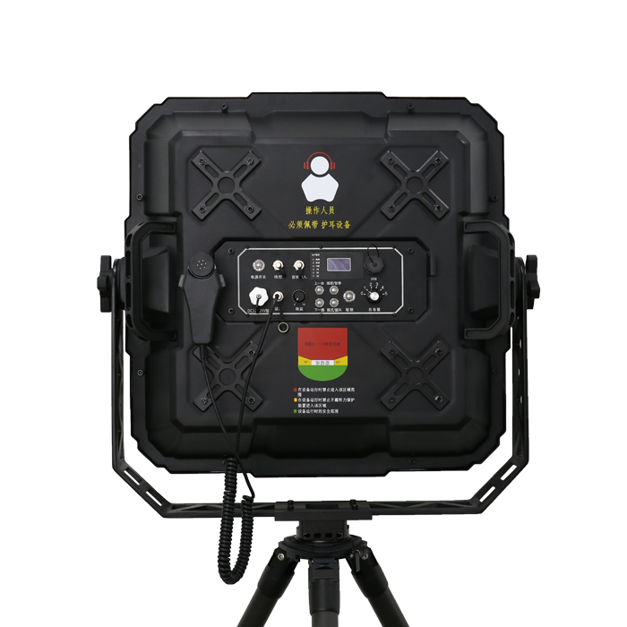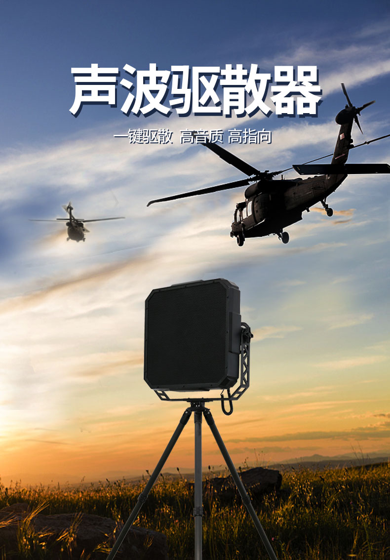 声波驱散器,吸收国内外先进产品技术及结合我们公司实际情况设计而成的全新迭代产品,主要由主机(碳纤维外壳)。三脚架、便携电源、携行箱、线缆、送话器、耳罩等组成。