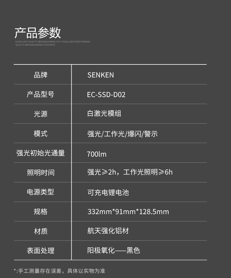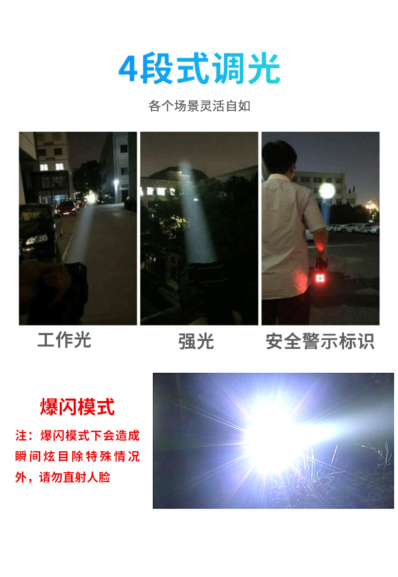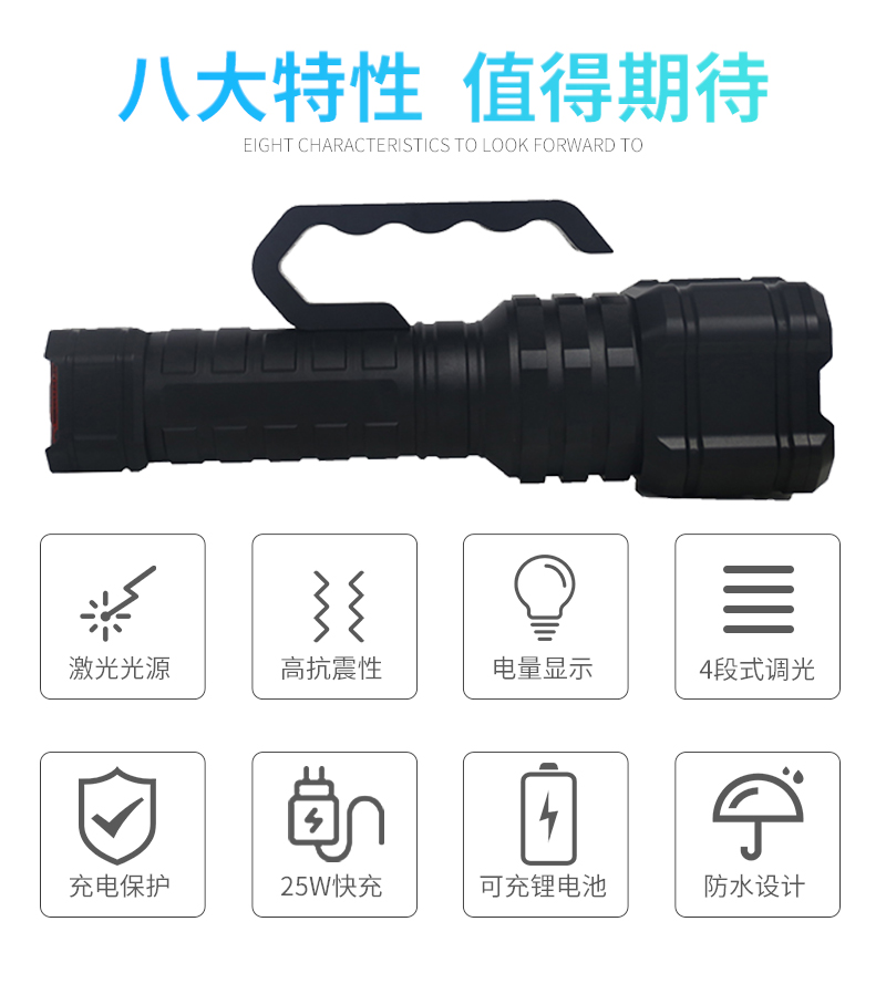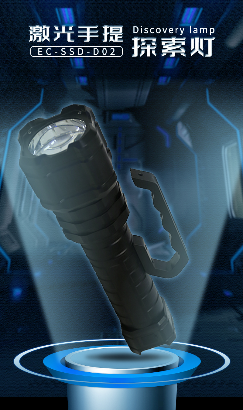激光手提搜索灯,功能多样,具备强光、工作光、爆闪三种调光模式;以适用于强光模式下远距离搜救,爆闪模式下瞬间炫目反恐,工作光模式下的照明及尾部的安全警示与位置标识。