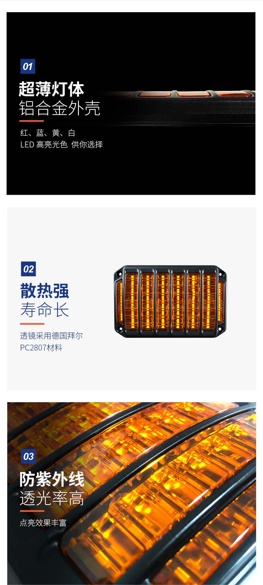 LTE2085 警示灯是我公司自主设计、研发的中高端产品,采用了高亮、高效、节能、环保的 LED 做为主光源,铝合金材料的上盖和散热底板,PC2807防紫外线的线性光学透镜,使产品更有质感。产品适用于特种、消防、工程等车辆安装应用。