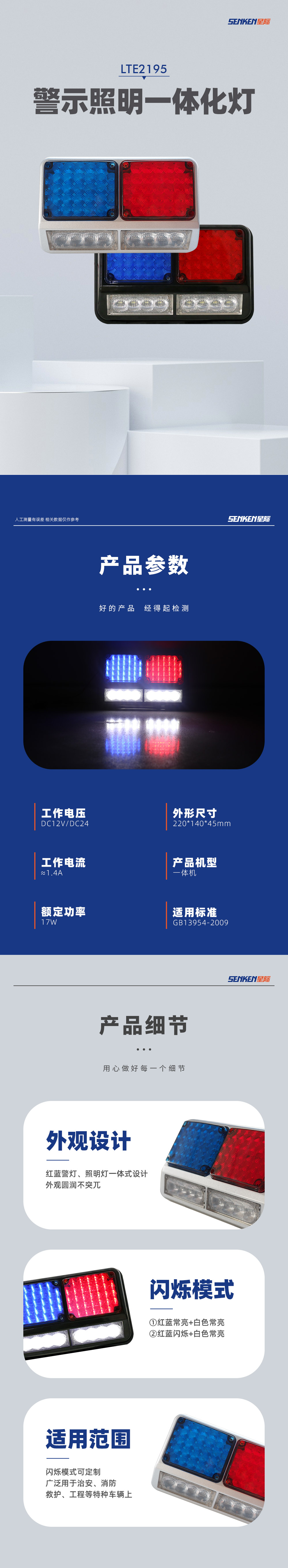 LTE2195警示照明一体化灯是本公司根据市场不同领域应用的需求新设计的一款全新的警示灯,它具有高亮度,低功耗,寿命长,高稳定性及易于安装等特点,并且同时具备警示灯功能与照明灯功能。可适用于不同领域的特种车辆的安装;照明灯组照射范围大,可单独控制,为车辆操作人员提供照明。