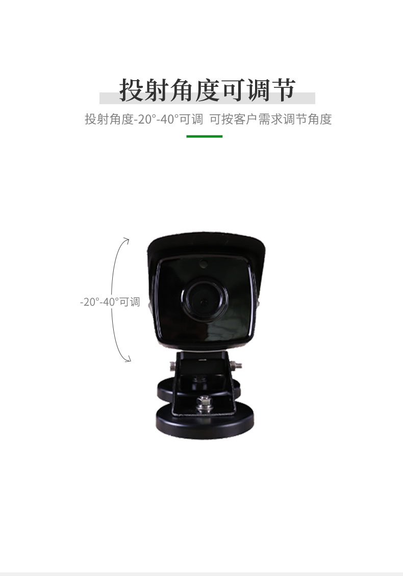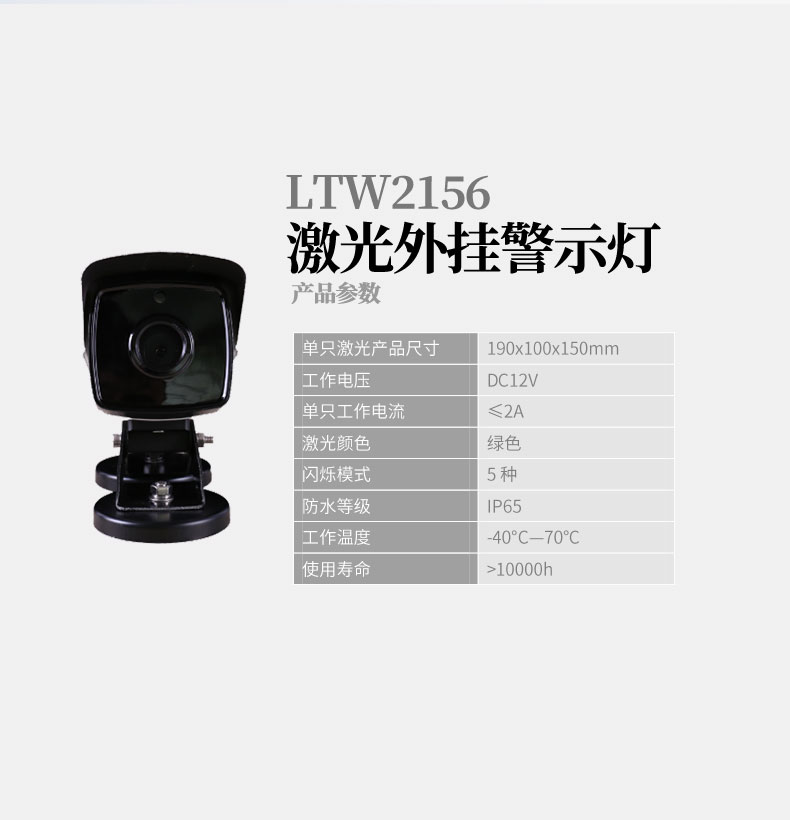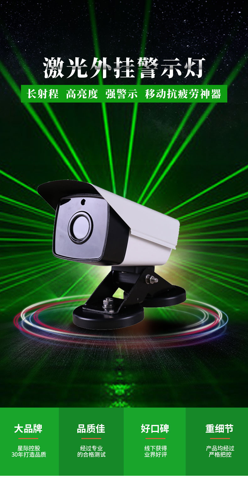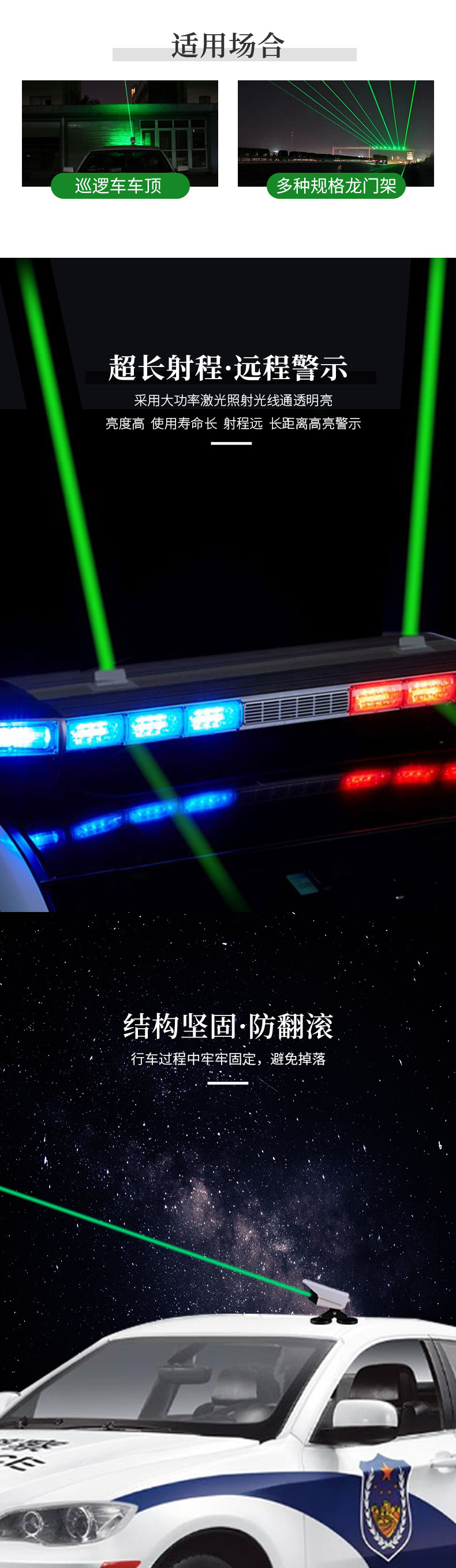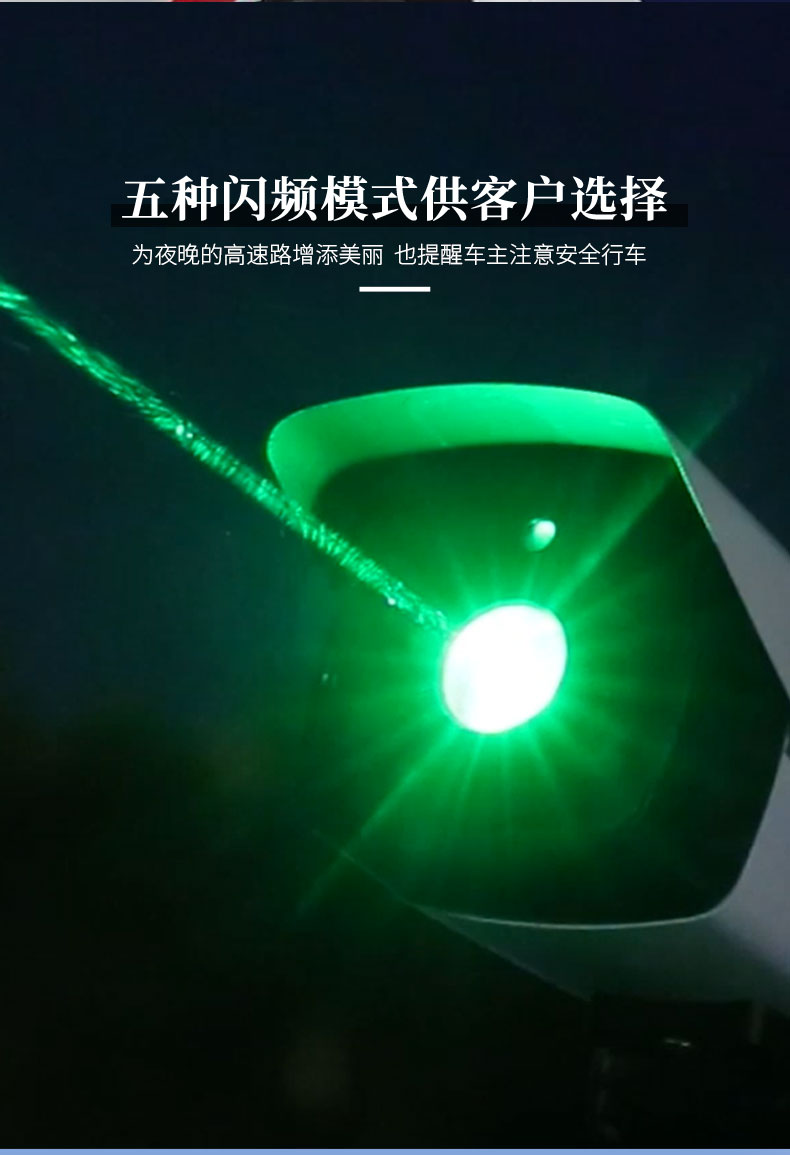 产品采用优化的结构设计,具备防水、抗摔、防滚动结构,便于安装,所占空间小,激光在夜晚清晰可见;产品可-20°-40°竖直调节,拥有多种模式,可根据客户需求做出多种样式,为夜晚的高速路增添美丽,也提醒车主注意安全行车。