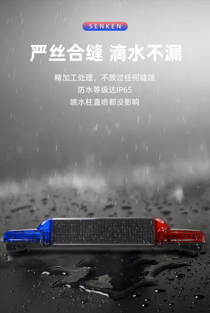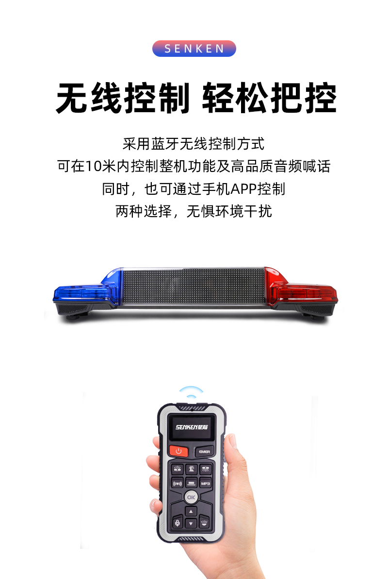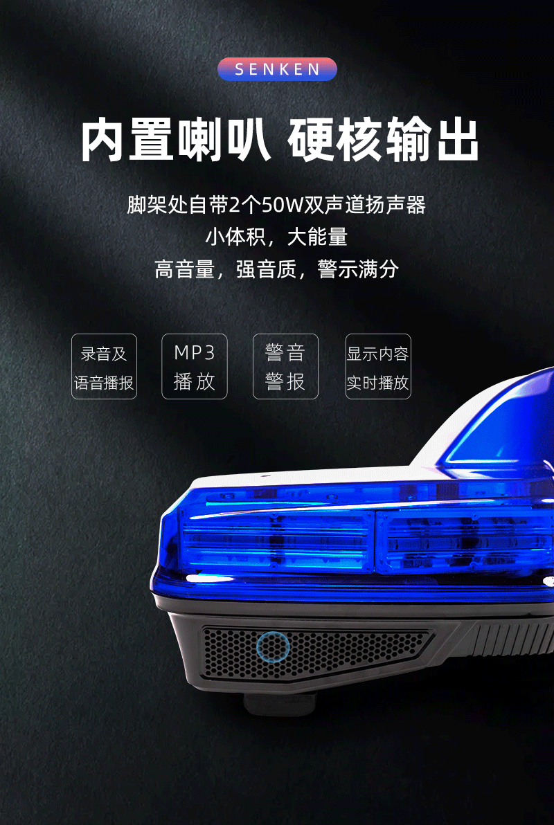 无线一体化警示显示屏是我公司综合国内外市场需求自主研发的新型警示灯具产品,稳重大气的产品外形设计凸显执法者的严肃形象,专业的功能结构设计其涵盖光学、声学、空气动力学、热传导、机械等,其应用了无线蓝牙技术、数字功放技术、DSP 调音技术、拾音移频技术、声学风洞技术等,针对性解决目前市场现有产品缺陷如:警音喊话不清晰、啸叫、产品安装种类多、低速使用、产品笨重、人机操作局限等问题,为道路交通执勤车辆提供一站式解决方案。