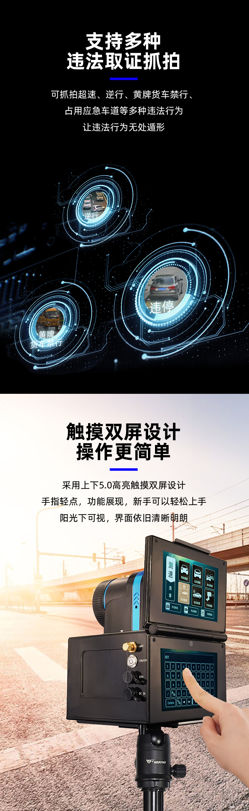 多功能雷达测速仪是我公司自主研发新推出的第三代执法设备,采用多屏折叠式设计,内置多种智能算法和支持多种违法取证,产品覆盖高速公路、快速公路、城市道路以及乡村道路等全道路全场景应用,一机多用。