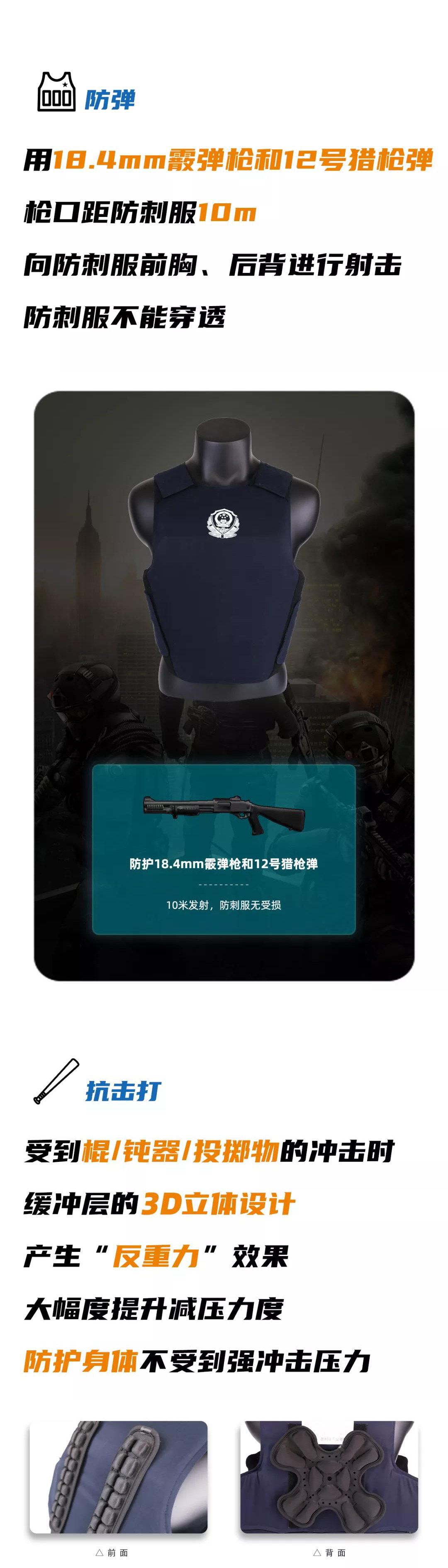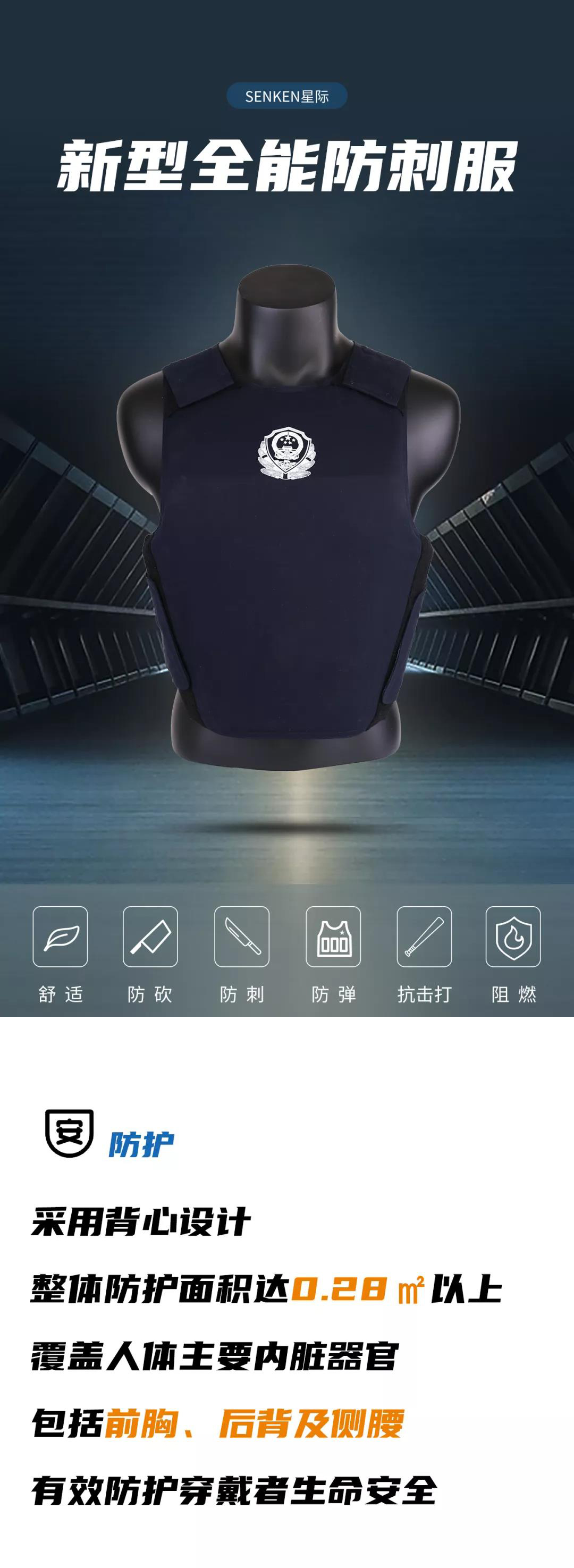 新型防砍防刺服通过采用薄金属防护层加硬航空铝合金材料,增强防刺性能的同时,增加防砍性能,能够有效抵挡各种刀/匕首/斧等利器伤害。同时,不同于传统防刺服的单一防护性能,此款防刺服升级加入防弹性能,能够有效抵挡18.4mm散弹枪和12号猎枪弹,做到防护多样性、集成性,适用于日常执勤、巡逻、维稳等特殊场景防护需要。