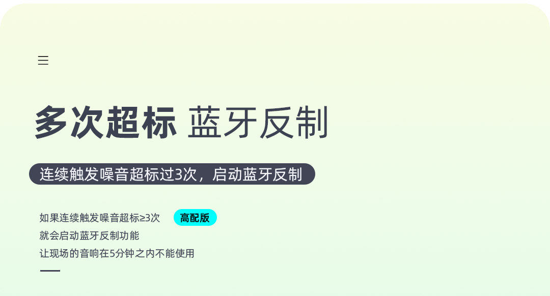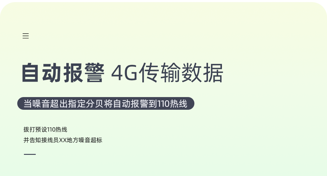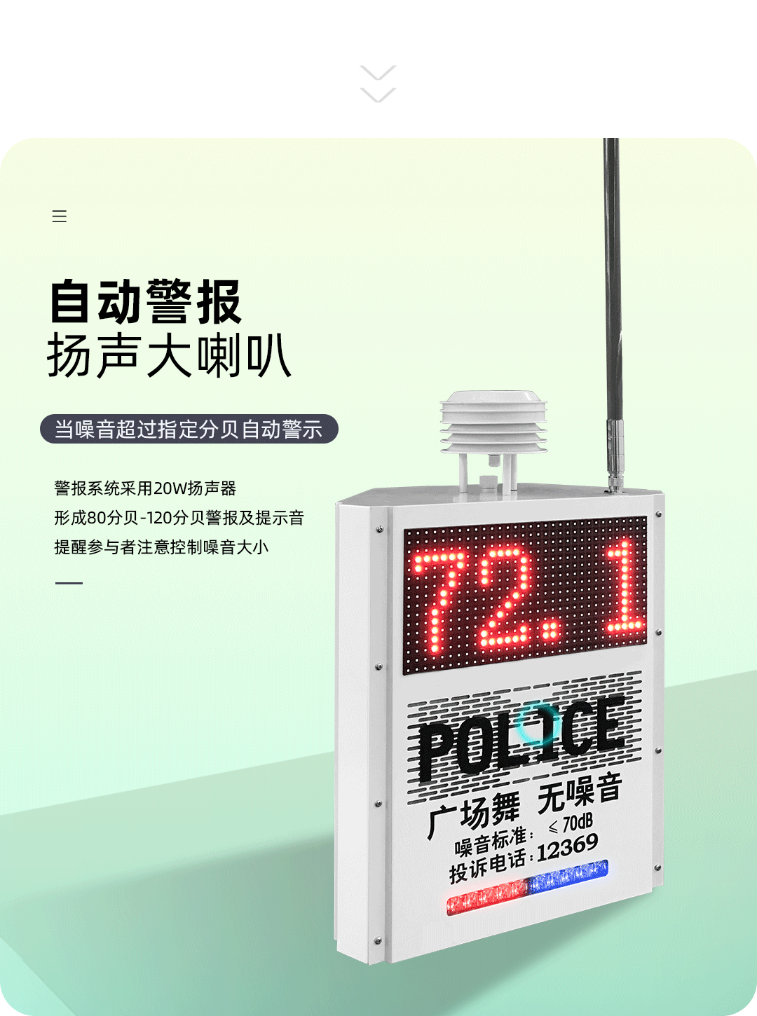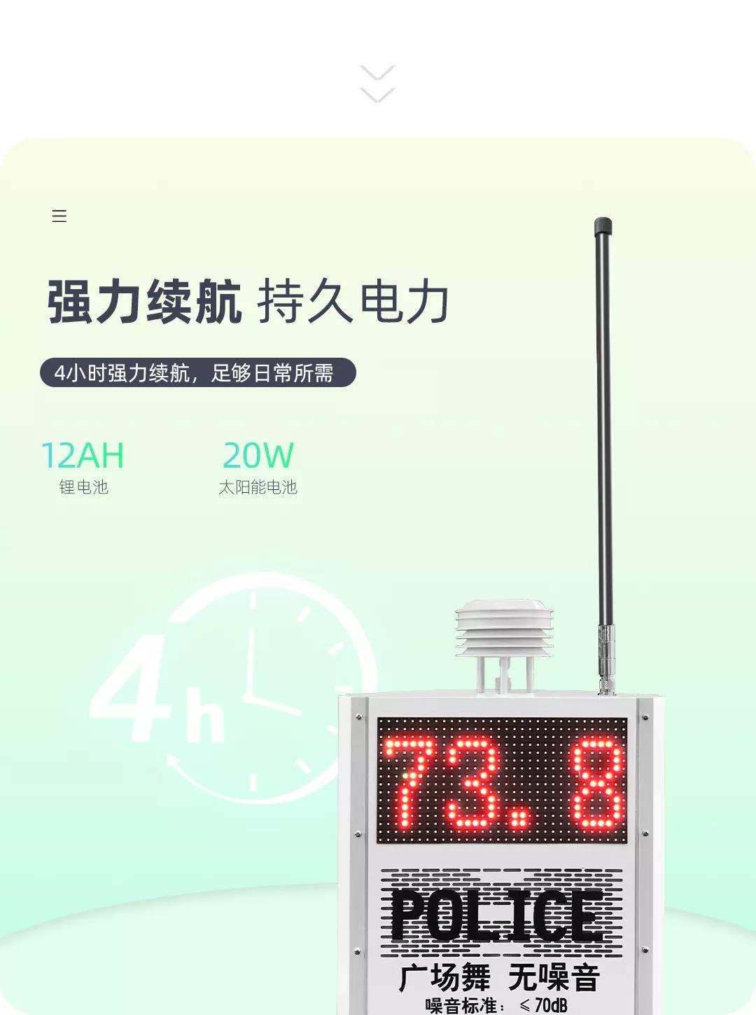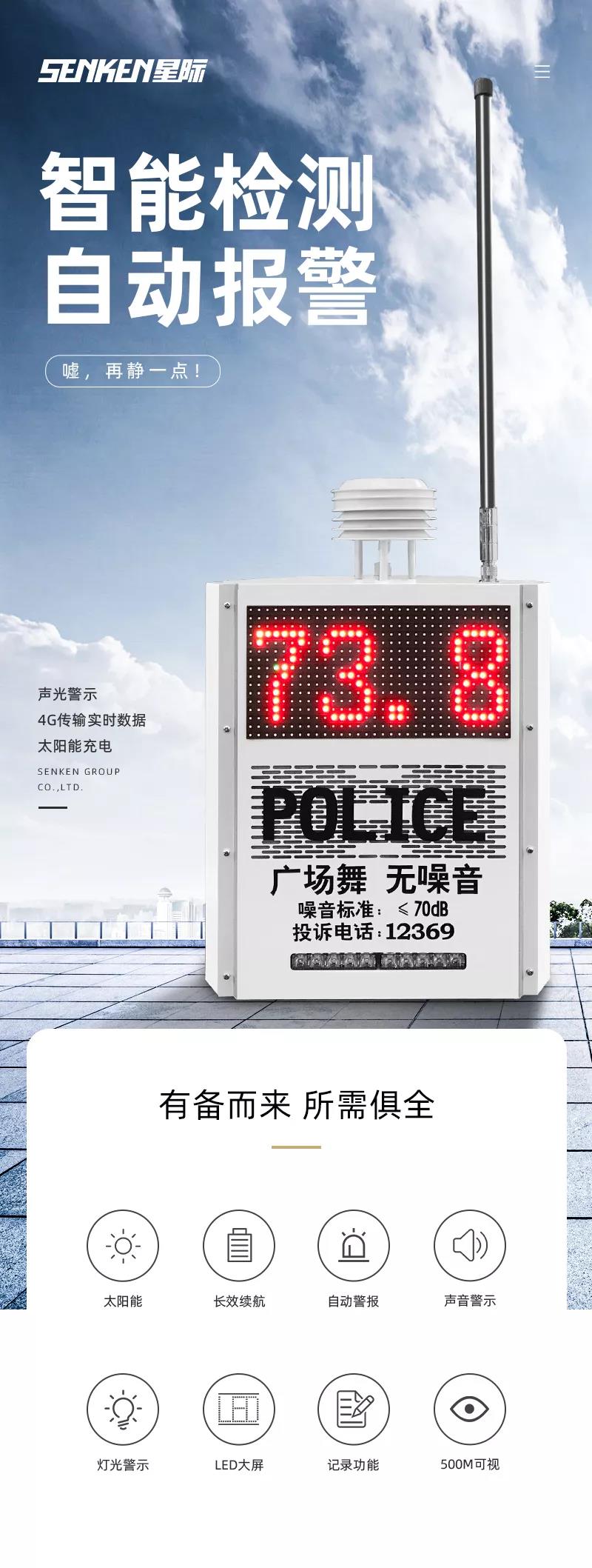 本公司新研制开发的ZYJC-SK01噪音检测系统,采用供电、噪音监测、声光警示、4G传输实时数据及超标自动报警一体化设计,供电采用太阳能电池供电,内置储能电池,为整个系统提供电能;警示系统采用大功率警示光源,避免光源污染,可在180°范围内形成有效警示;警报系统采用20W功放驱动20W扬声器,可形成80dB-120dB的警报及提示音,提醒参与者注意控制噪音大小,避免对周边人员产生干扰。