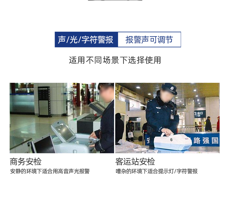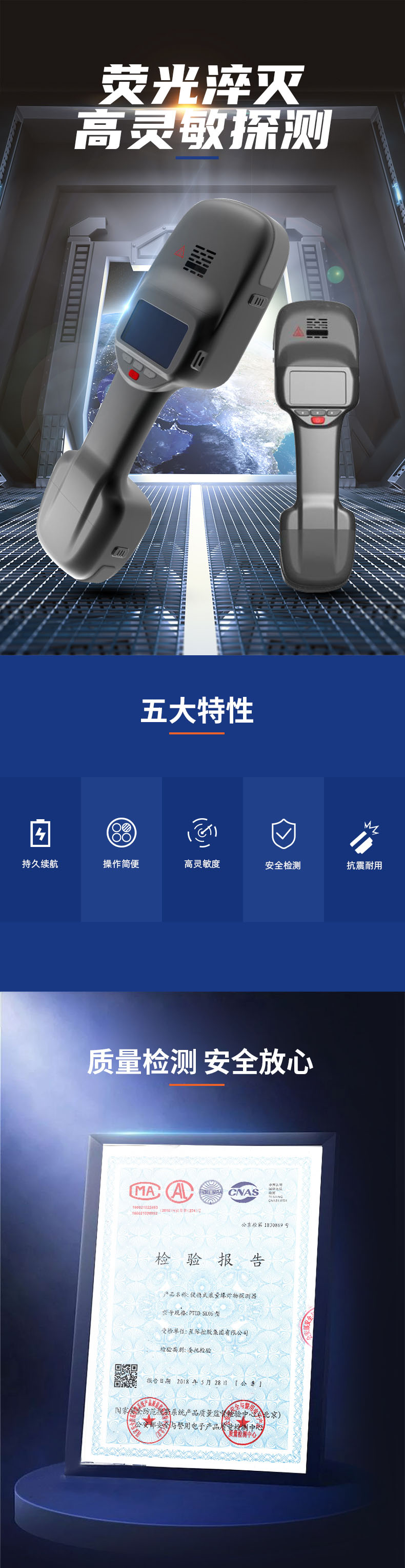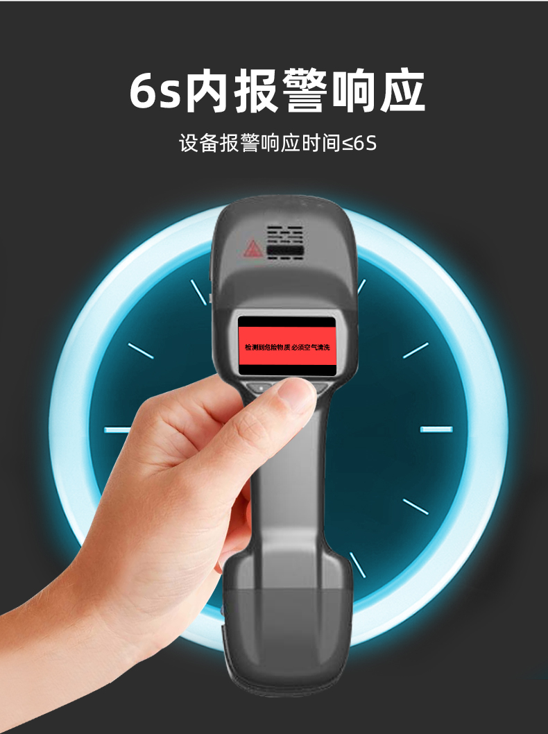 便携式痕量炸药探测器采用新的荧光聚合物传感技术,是一种基于物质分子对荧光聚合物所发射荧光的光度变化实现对物质分子识别的技术。通过擦拭采样或吸气采样,当检测到炸药分子,聚合物发射的荧光瞬间由亮变暗,通过检测聚合物的荧光强度即可识别周围环境中是否有炸药分子存在。