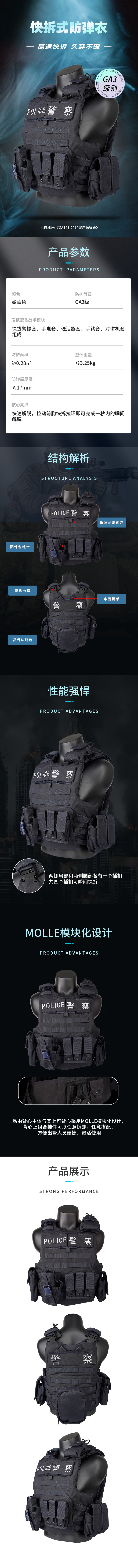 此款防弹衣主体采用防阻燃、防水牛津布面料,具有抗撕拉,耐磨性好等优势,防护性能高,能够有效防护人体主要部位安全。同时,采用MOLLE模块化设计,可根据实战需求进行装备挂载、搭配,方便出警人员便捷、灵活使用。一秒快拆的设计,更是能够有效提升穿套速度,助力出警效率提升。