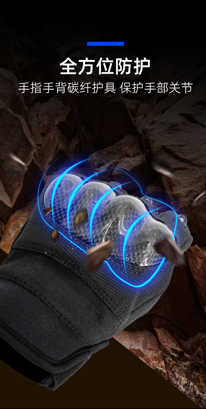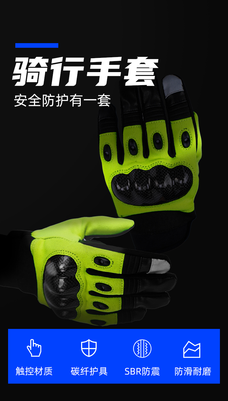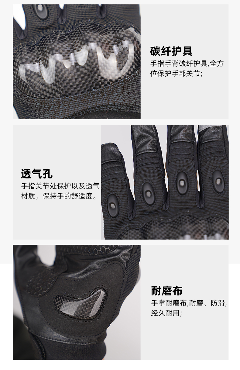 夏季骑行手套的手指手背设计有碳纤护具,手心设计有SBR防震片,手掌采用耐磨布料,保证安全、防滑、避震功能,食指采用可触屏设计,方便操作,适用于特警铁骑夏季骑行。