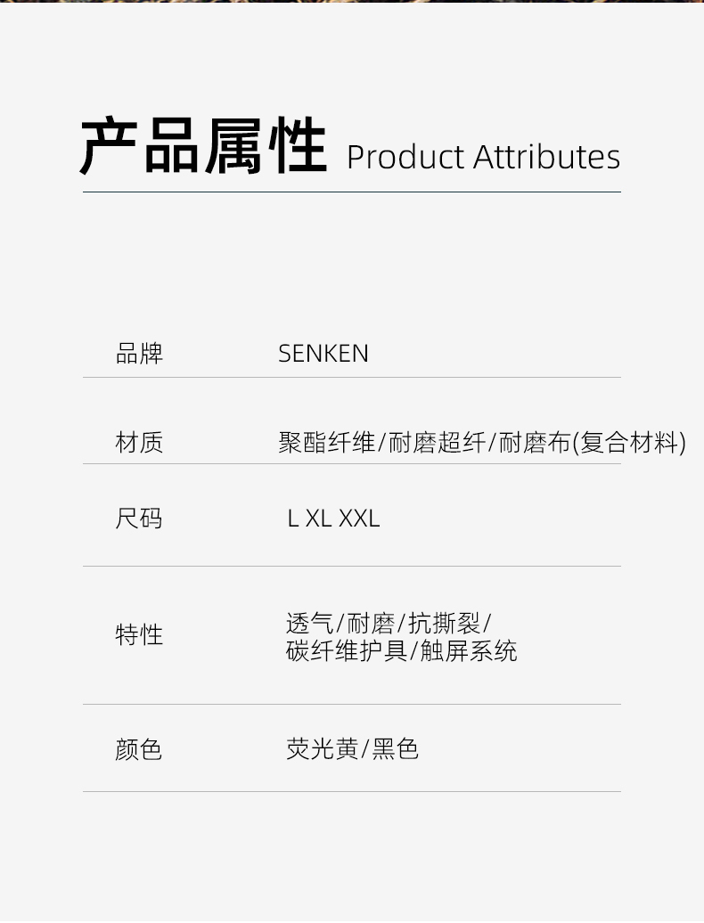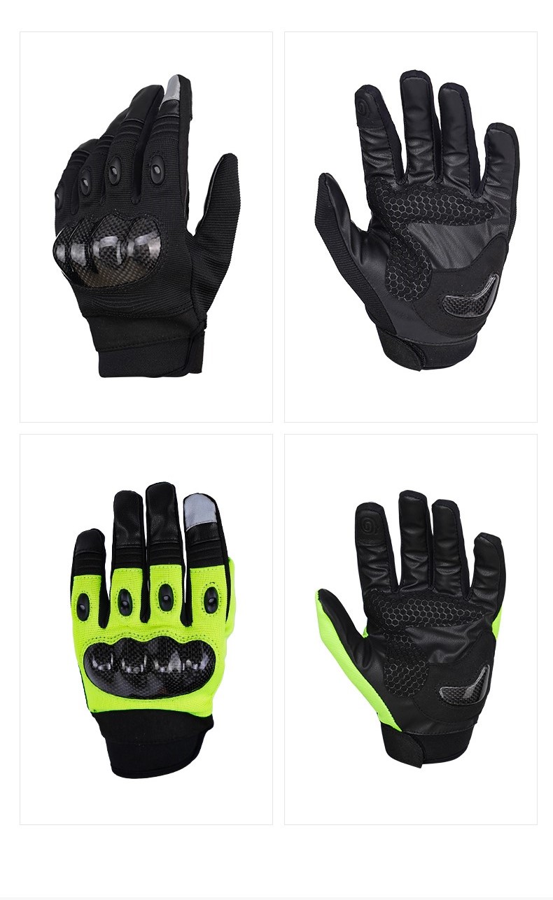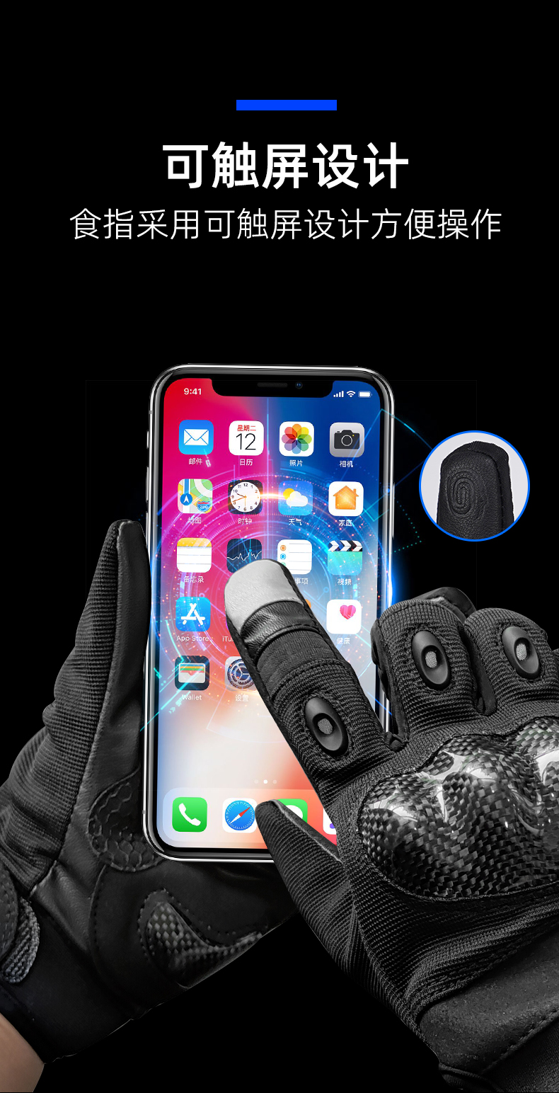 夏季骑行手套的手指手背设计有碳纤护具,手心设计有SBR防震片,手掌采用耐磨布料,保证安全、防滑、避震功能,食指采用可触屏设计,方便操作,适用于特警铁骑夏季骑行。