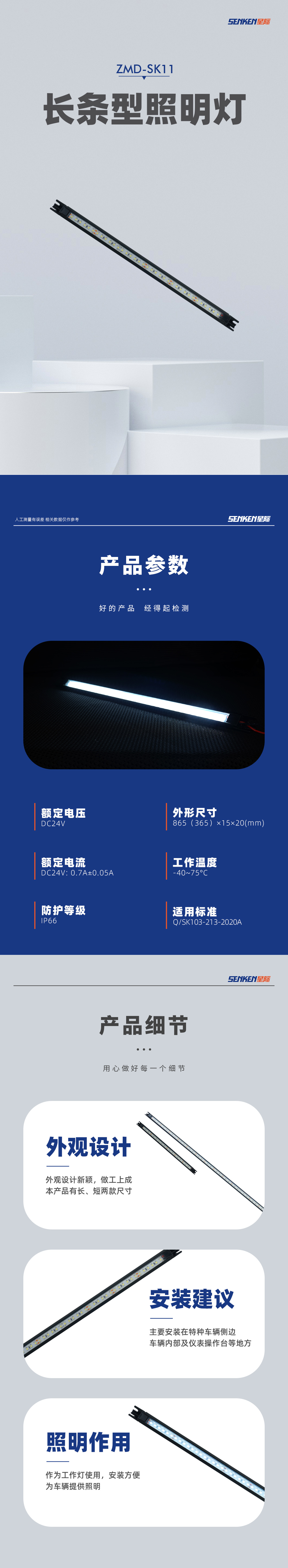 ZMD-SK11条形照明灯外观设计新颖,做工上成,本产品有长、短两款尺寸,作为工作灯使用,安装方便,为车辆提供照明。本产品主要安装在特种车辆侧边、车辆内部及仪表操作台等地方。