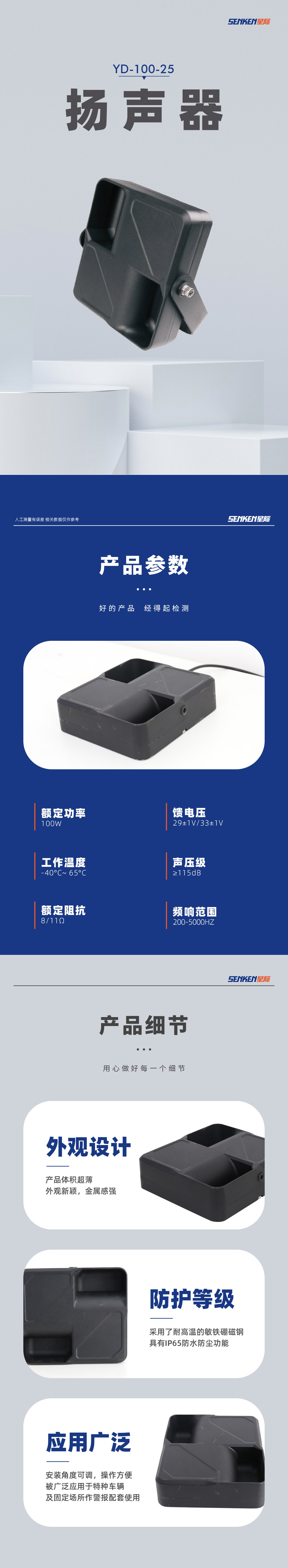 YD-100-25扬声器是我司采用国际先进的技术工艺,专为各式电子警报器、报警器装置而设计的超薄新产品。它采用了耐高温的钦铁硼磁钢,内磁结构,加注进口磁流体,具有外观新颖超薄、音质清晰、防水、耐腐蚀、密封性好等优点,各项电声参数均达到国内同类产品领先水平,被广泛应用于特种车辆及固定场所作警报配套使用。