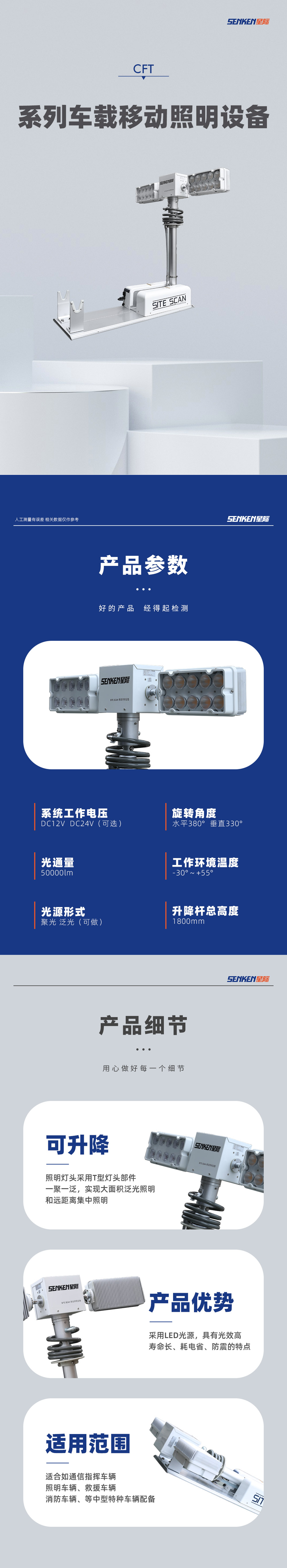 车载移动照明设备是升降气杆升起时,高度为1.8米的照明设备系列。适合如通信指挥车辆、照明车辆、救援车辆、消防车辆、等中型特种车辆配备。