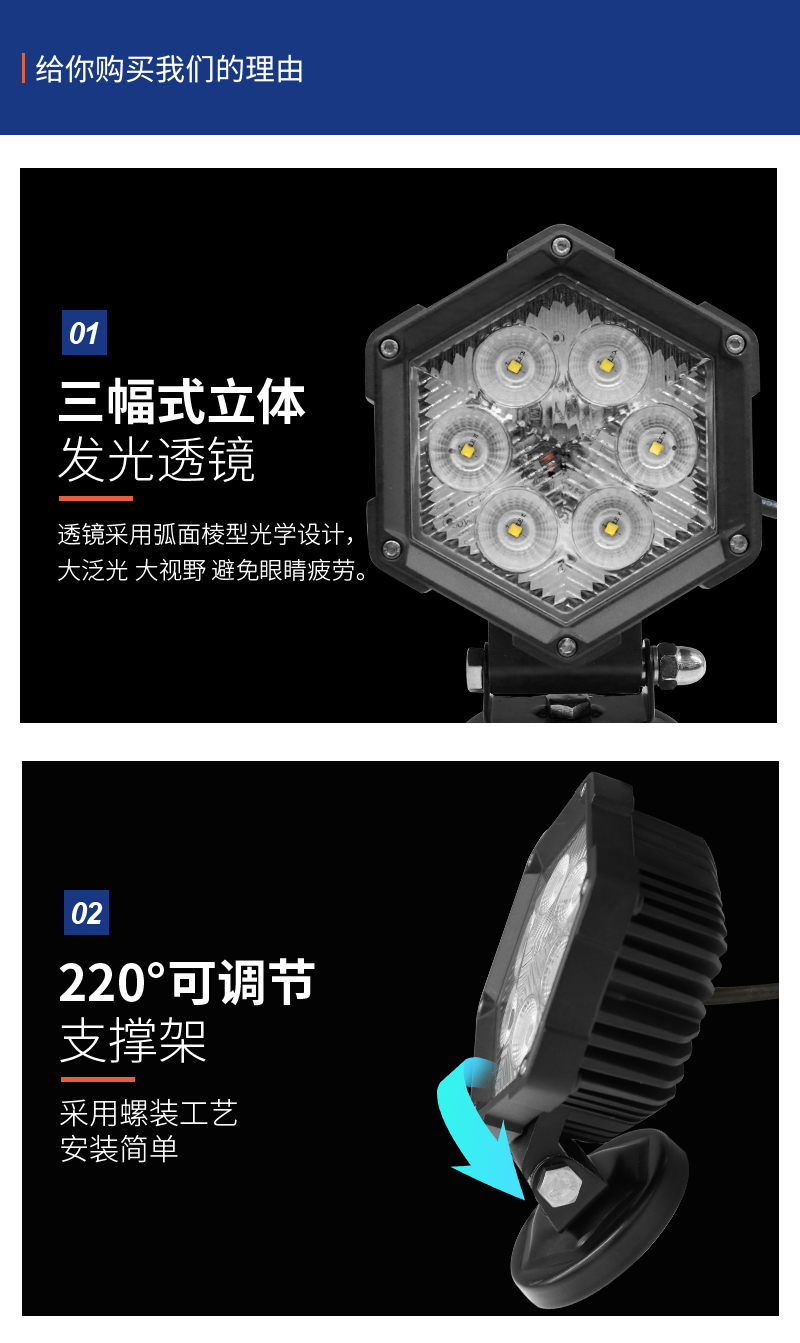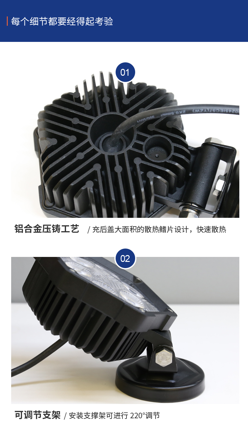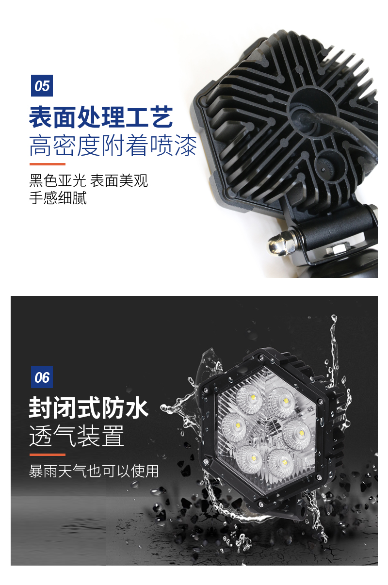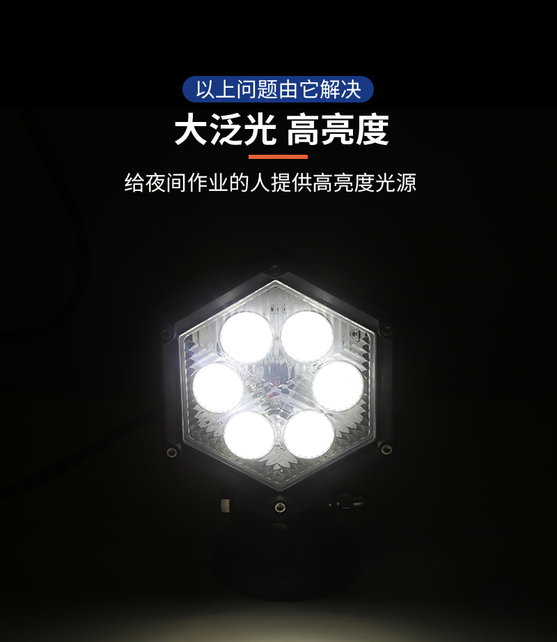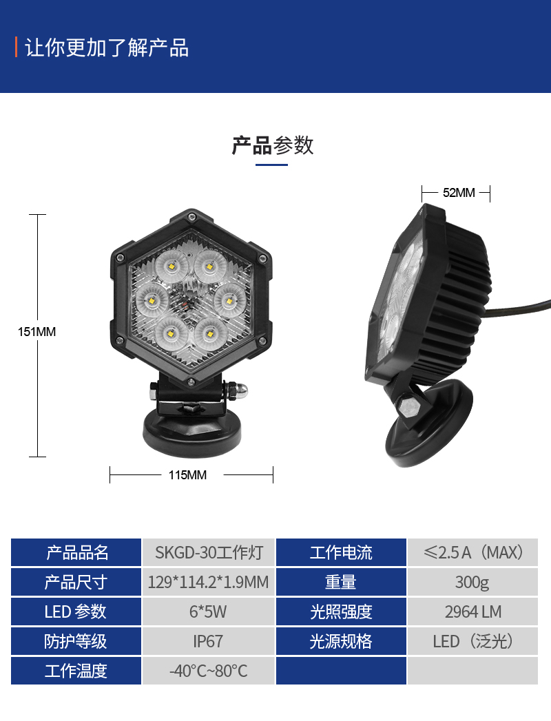 SKGD-30工作灯是本公司新开发的一款泛光型LED辅助照明灯,产品外观以六边形工业化的造型结合PC面双层透光罩,即使在太阳光下也能很好的体现剔透晶莹的质感。 适用于SUV,卡车,沙滩车或UTV的越野驾驶灯,并且还可以用于工矿车辆、特种车辆和农业车辆照明;适用范围广,可兼容配备12-24V直流电源的汽车和设备。