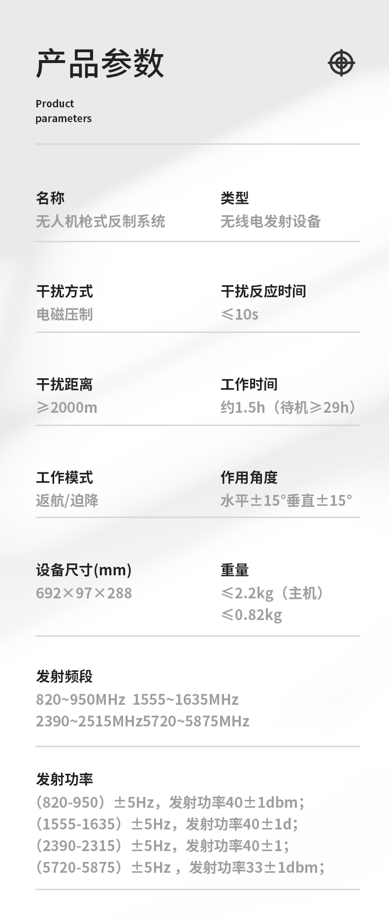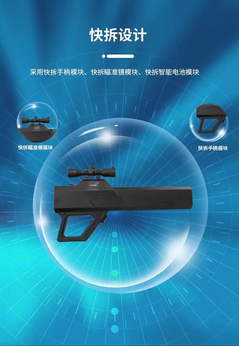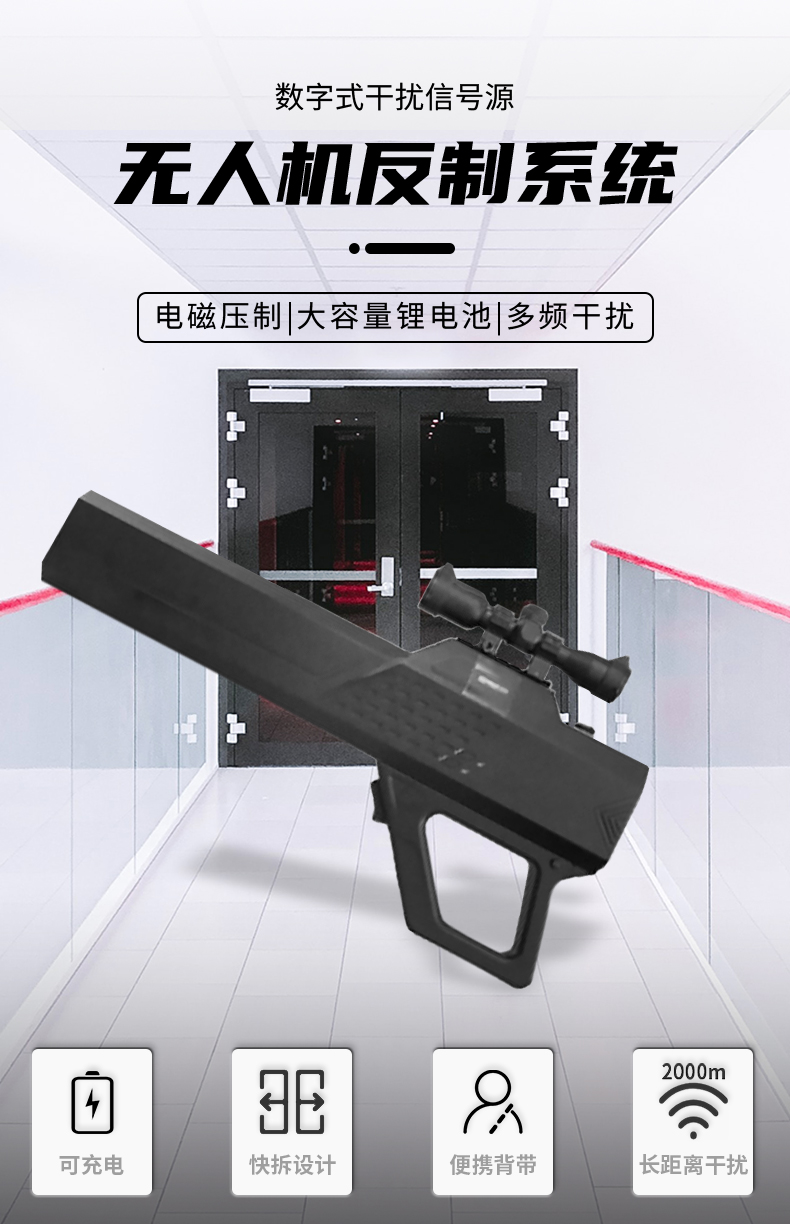 便携式反制设备通过发射电磁波信号阻断无人机和遥控装置间通信链路并可干扰无人机接收卫星导航信号,从而使无人机产生返航或迫降的效果,具备远距离的无人机目标管控能力,共有三种形态。