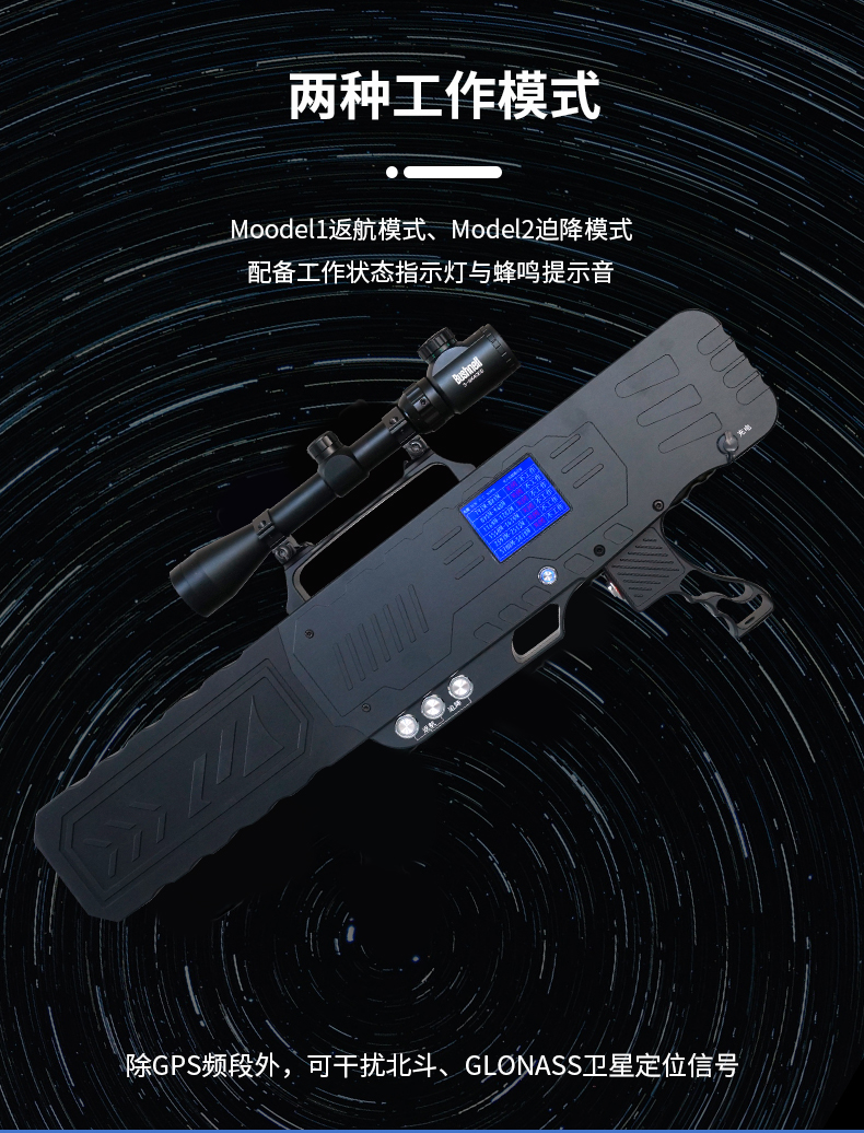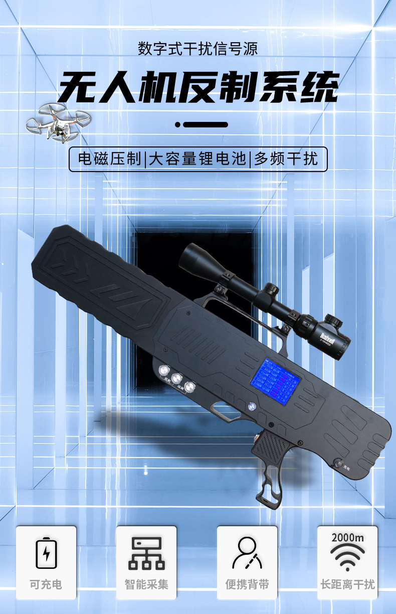 便携式反制设备通过发射电磁波信号阻断无人机和遥控装置间通信链路并可干扰无人机接收卫星导航信号,从而使无人机产生返航或迫降的效果,具备远距离的无人机目标管控能力,共有三种形态。