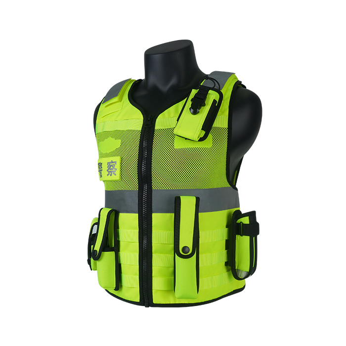 背心主体采用外侧双层网孔设计,呈现六面透气中空立体的结构面料,装具采用聚醋纤维面料。