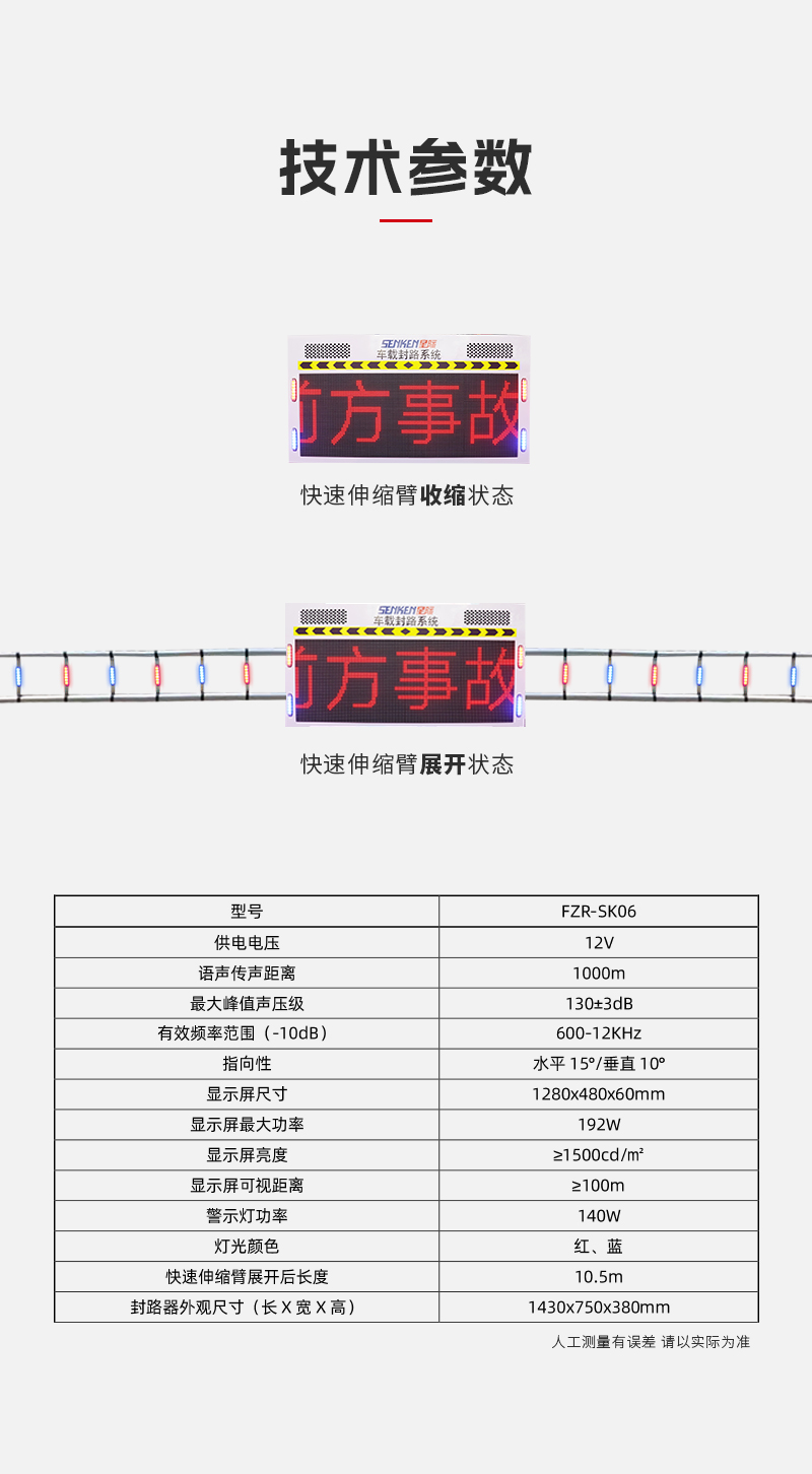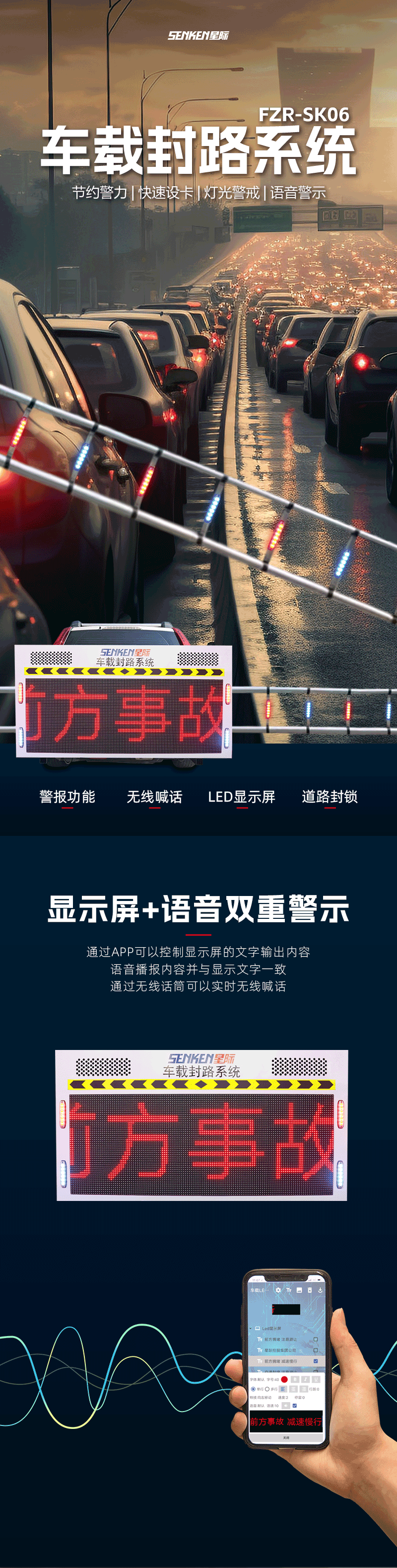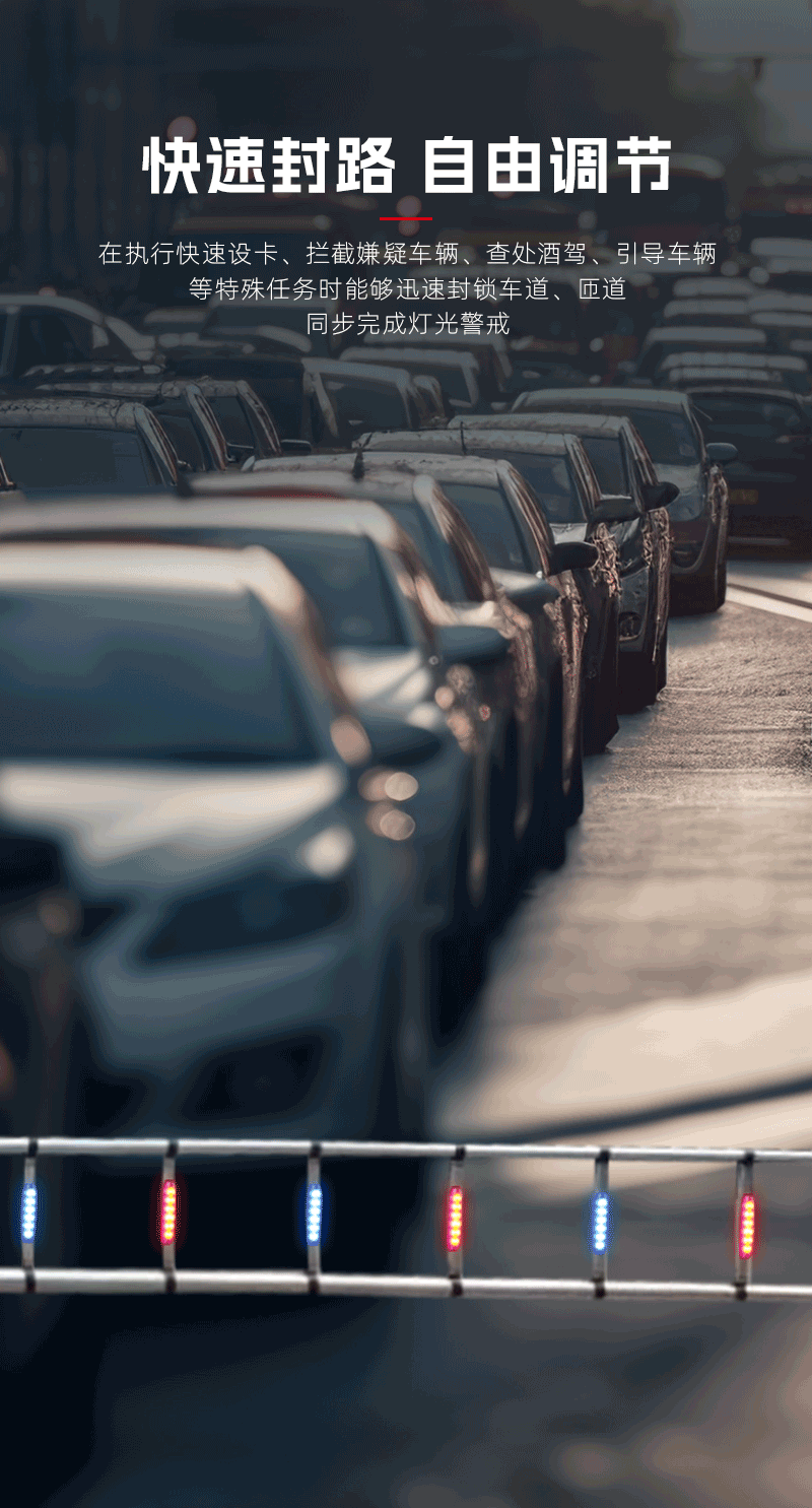 该产品可以提高执勤警车面对复杂路况和交通事故现场的警戒能力,能够在恶劣天气下提高控制路面的能力,有效节约警力,缓解车辆和人员不足的短板;在执行快速设卡、拦截嫌疑车辆、查处酒驾、引导车辆等特殊任务时能够迅速封锁车道、匝道,同步完成灯光警戒,语音警示,提高执法安全防护能力,保障执勤人员的人身安全。