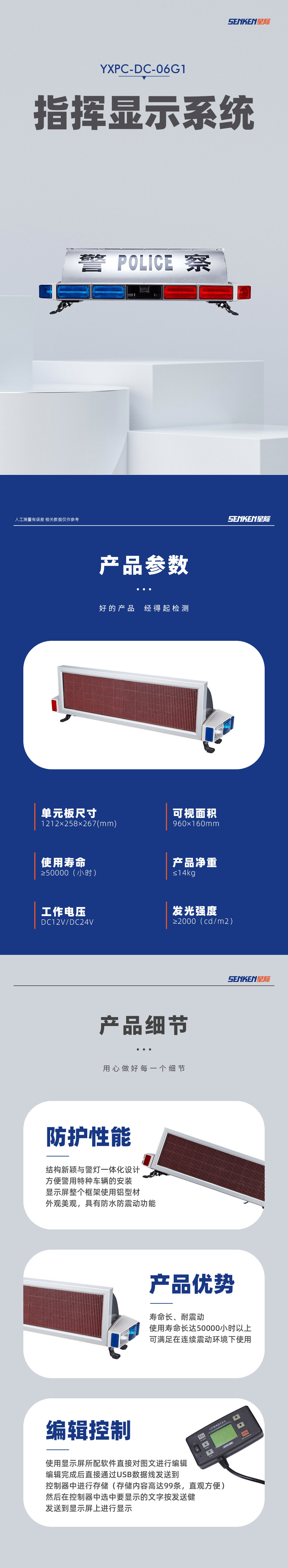 大功率LED发光二极管或氙气灯管作为发光光源; 采用科学合理的配光设计,工作时发光面积大、亮度高,且具有寿命长; 抗震性强、安装便捷、操作简单、携带方便等特点; 广泛应用于治安、消防、救护、工程等特种车及车站、码头、岗亭、公路两旁等特种场所中使用。