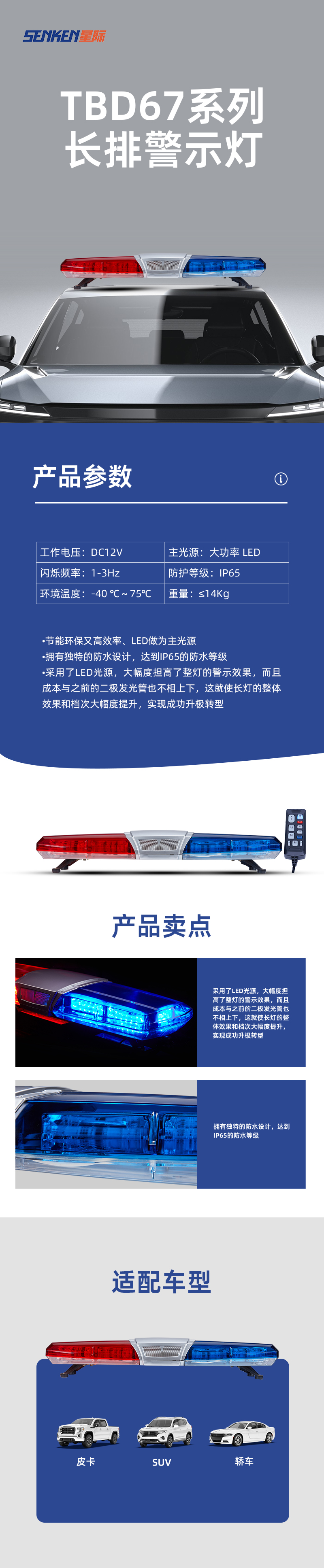 TBD670000系列长排警示灯是我公司自主设计开发的中低端产品,充分考虑运动学和力学的需要,达到与车的完美结合,整体效果充分显示了警车的威严与庄重,历时半年的国内外市场调研和研发,成功开发了又一款具有自己知识产权的长排警示灯产品。该产品已获得了外观设计专利权,是目前国内中高档流线型警示产品,广泛应用于公、检、法、司及消防、工程、救护、公路、电力等中高档特种车辆作警示设备之用。