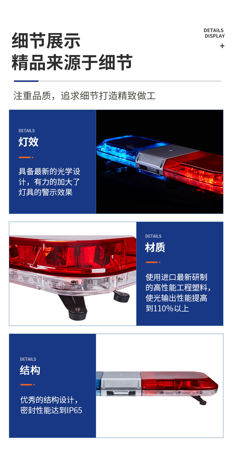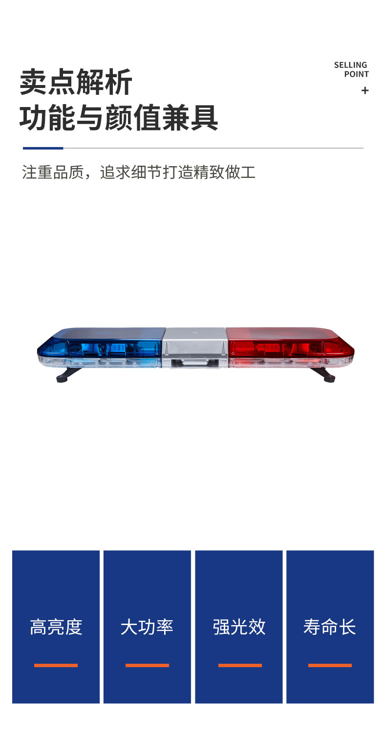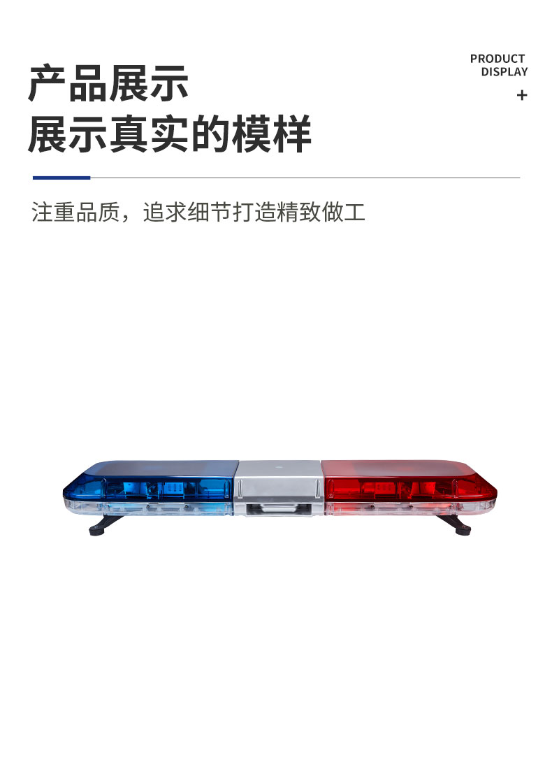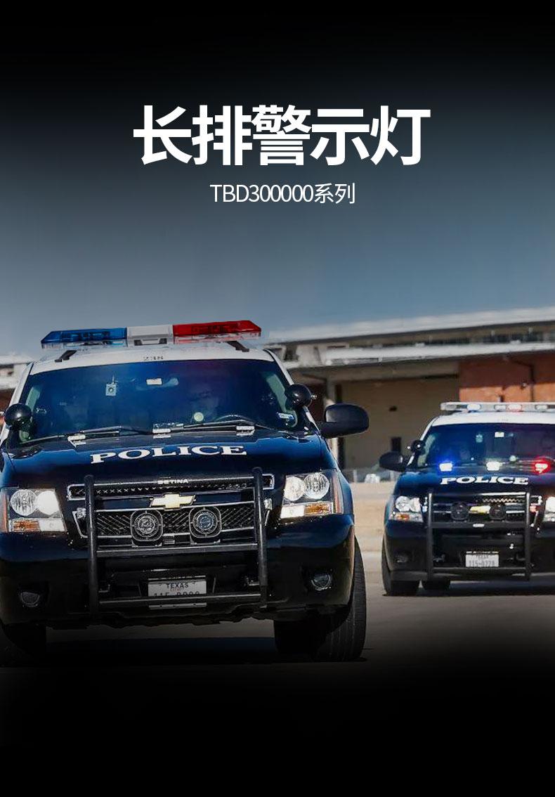 TBD300000长排警示灯是我公司新开发的双层超薄长排警示灯。警示灯的四周成圆弧流线型是减少风阻的创意。灯罩采用抗冲击强度、热稳定性高、透光率好的PC材料加工而成,并通过先进的表面工艺处理使灯罩透光率高、不易退色、抗震、抗风沙、抗划伤性能强、防水性能好。具有双层警示效果,可分层控制。本灯可以采用专用灯控器或专用警报器控制。光源设计别具一格。内部光源配置根据需求选用大功率LED灯管,灯光视觉无盲区,具有360度高亮度警示效果。中下罩内部设计可安装 扬声器,整个发声口设计与整灯的外形融为一体,使长灯更具有美观。可广泛用于公安消防、救护工程车辆及其它特种领域。