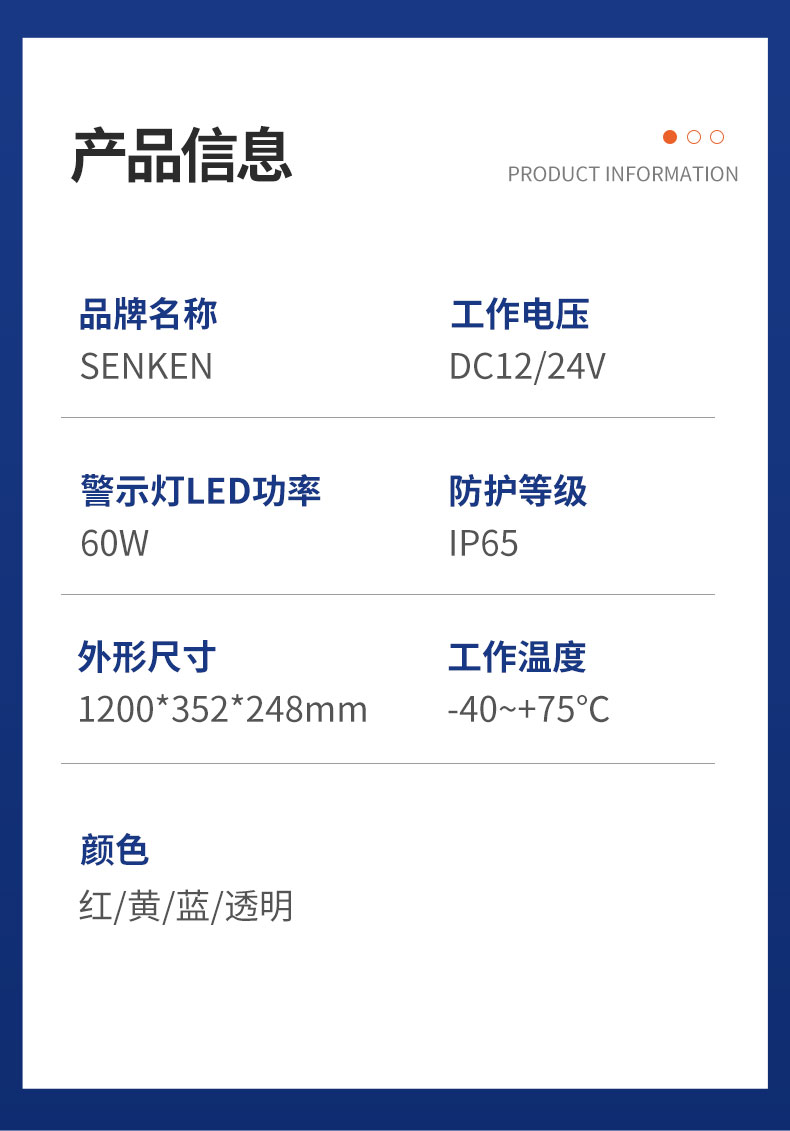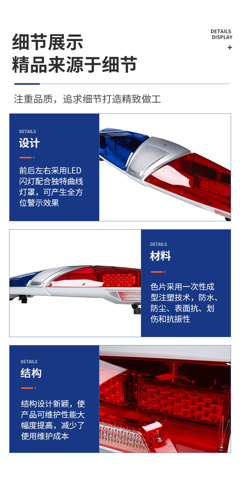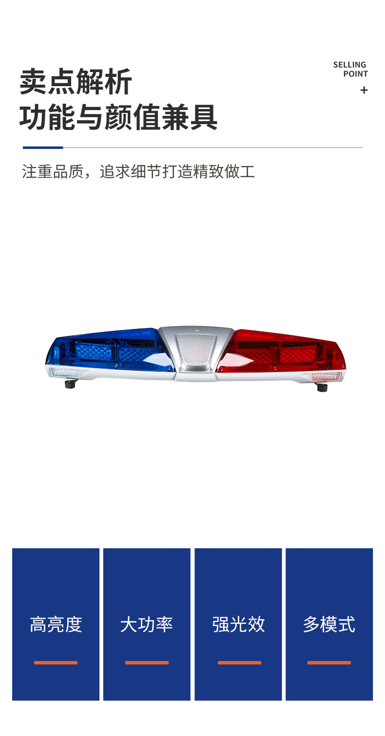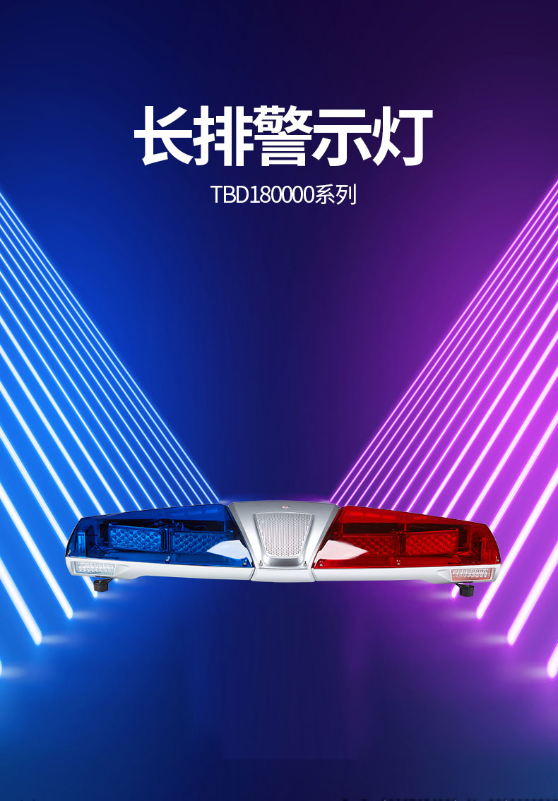 TBD180000系列长排灯是我公司国外专业公司联合设计开发具有代表现代潮流的中高端产品,设计过程中采用了先进的外观优化造型软件,结合历时半年时间的国内外市场调研,成功开发了具有自己知识产权的产品。 该产品采用了高亮LED光源,优化的电路和工艺设计,双声道内置扬声器布局,主光源反光镜达到了高效的全屏反射技术,发挥了强烈的震慑警示效果。不同颜色的色片采用一次性成型注塑技术,防水、防尘、表面抗划伤和抗振性能均达到国内领先水平。该产品已获得了实用新型和外观设计专利权。是目前国内中高档流线型警示产品,广泛应用于公、检、法、司及消防、工程、救护、公路、电力等中高档特种车辆作警示设备之用。