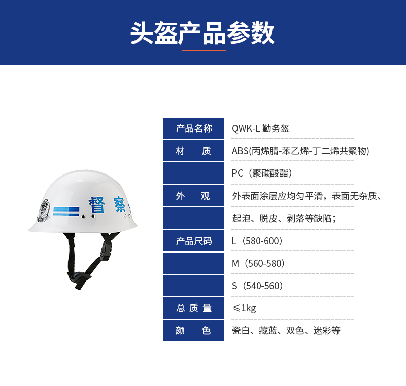 QWK-01 勤务盔是一种用于防止头部及面部受到打击或其他潜在的伤害性攻击的警用装具。本头盔采用高强度ABS和PC材料制造,头盔由壳体、缓冲层、佩戴装置等组成,具有线条流畅,视野宽阔,透光率好,佩戴牢靠、舒适、解脱方便等特点,符合《GA296-2001警用勤务头盔》标准的规定。是警务人员在日常执勤巡逻中保障自身的必备防护装备。