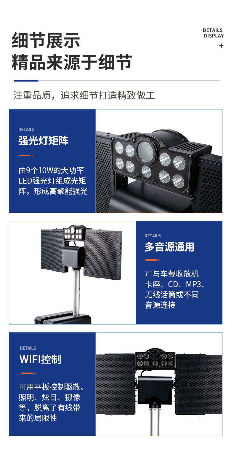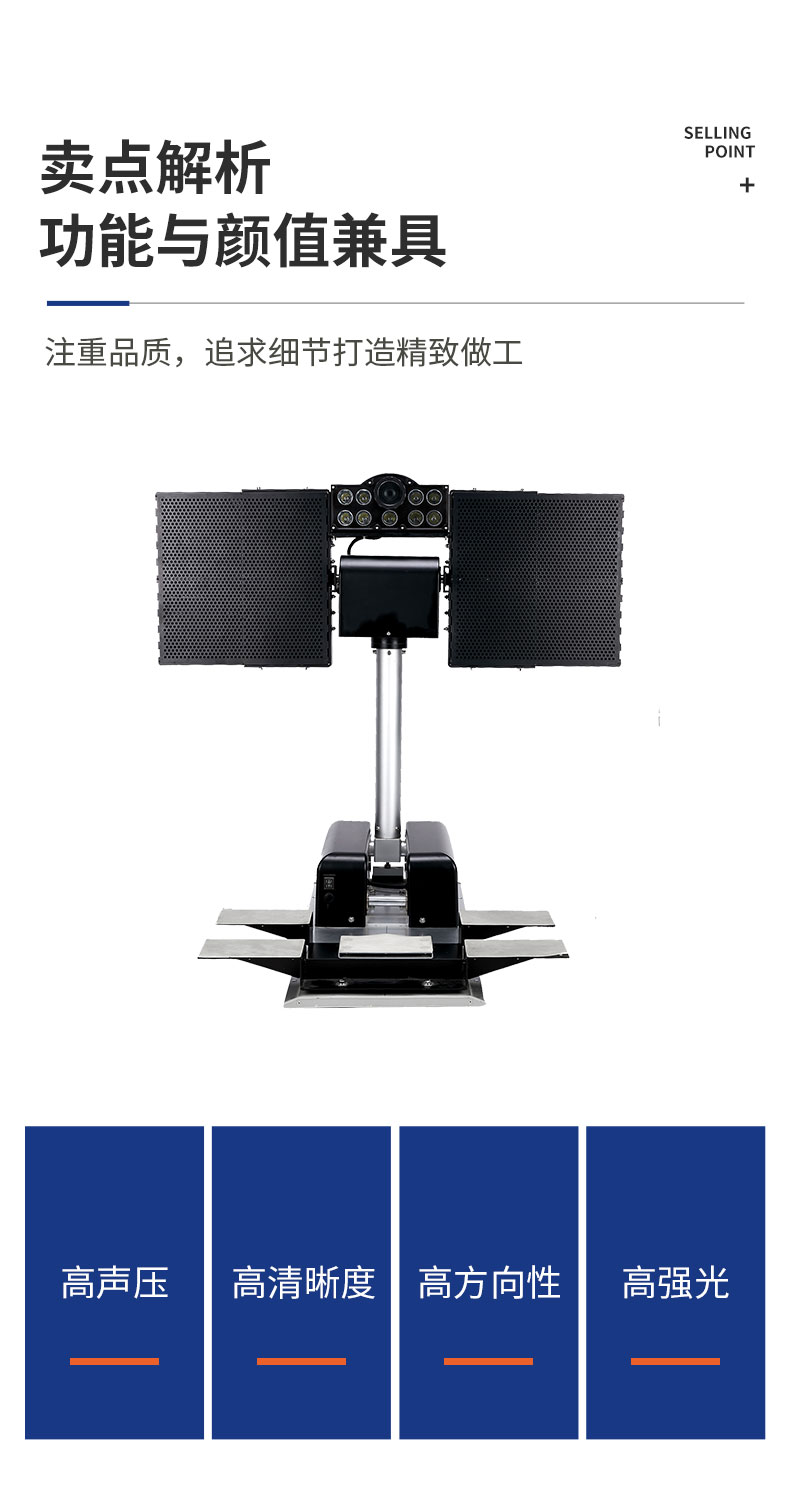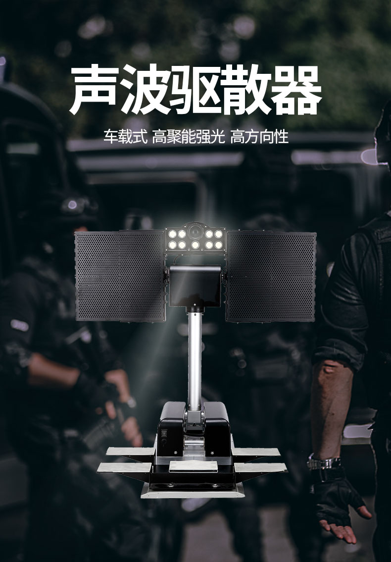 声光车载驱散器能适应任何环境变化,具备较强机动性、高亮照明、高方向性、高声压等优势,适用于应急警报、广播、喊话、治安、抗暴、防卫等特殊现场的远距离声波驱散器。