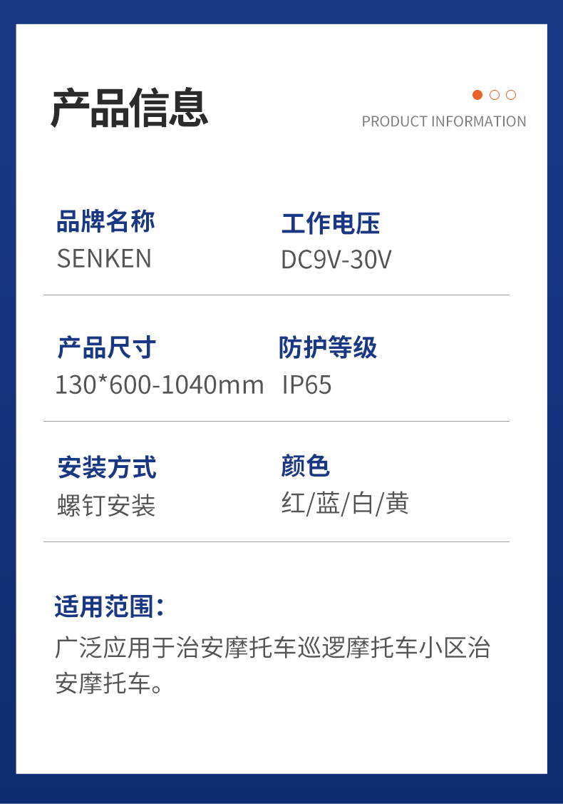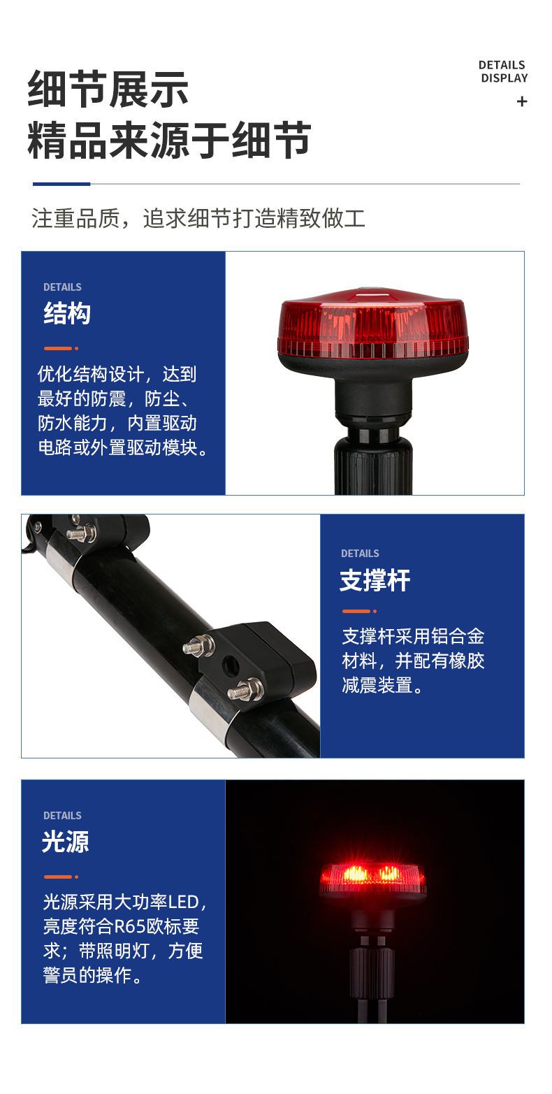 国际流行款式,外形美观、大方;超薄厚度;采用大功率LED,可通过ECE R65 T1标准;防护等级:IP66;360度旋转模式与爆闪模式切换。