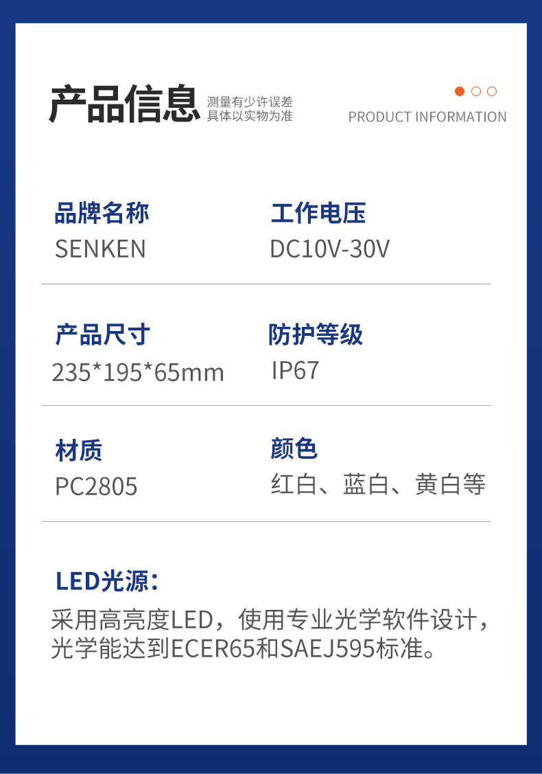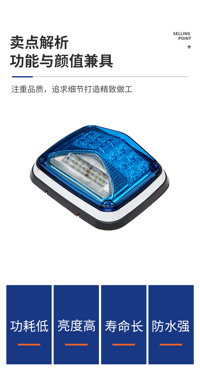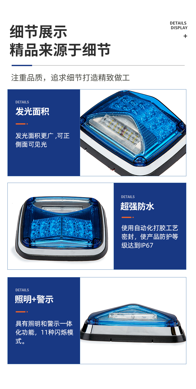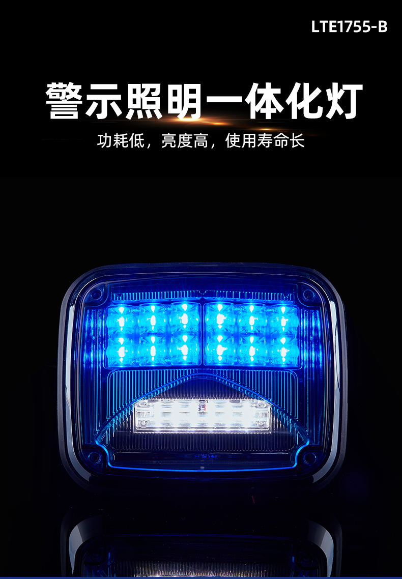 LTE1755警示照明一体化灯,采用大功率LED为光源,同时具备警示灯功能与照明灯功能。造型新颖,结构坚固,操作方便;警示灯组可选择多种闪烁模式,且灯光能达到180°可视;照明灯组照射范围大,可单独控制,为车辆操作人员提供照明。