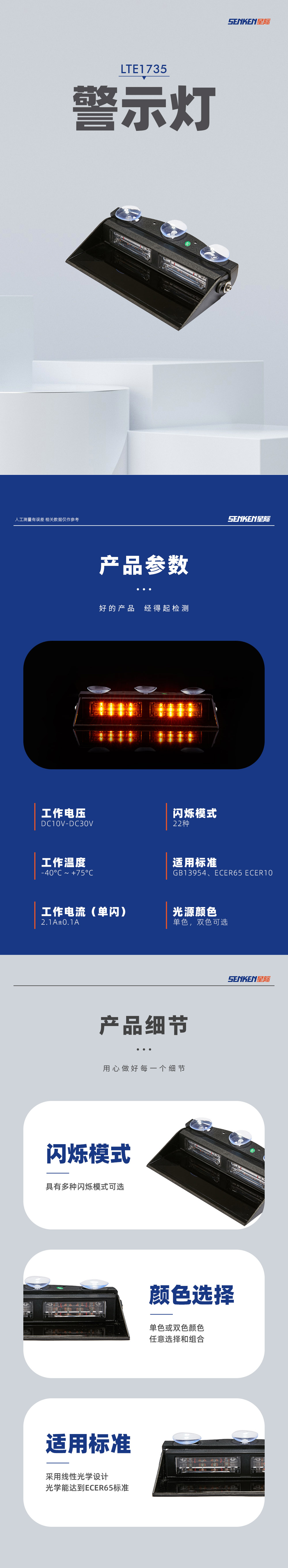 LTE1735警示灯采用线性光学设计,可根据需要进行单色或双色颜色任意选择和组合,具有多种闪烁模式可选,且安装简单、方便,适用于各种特种车辆灯光警示用。
