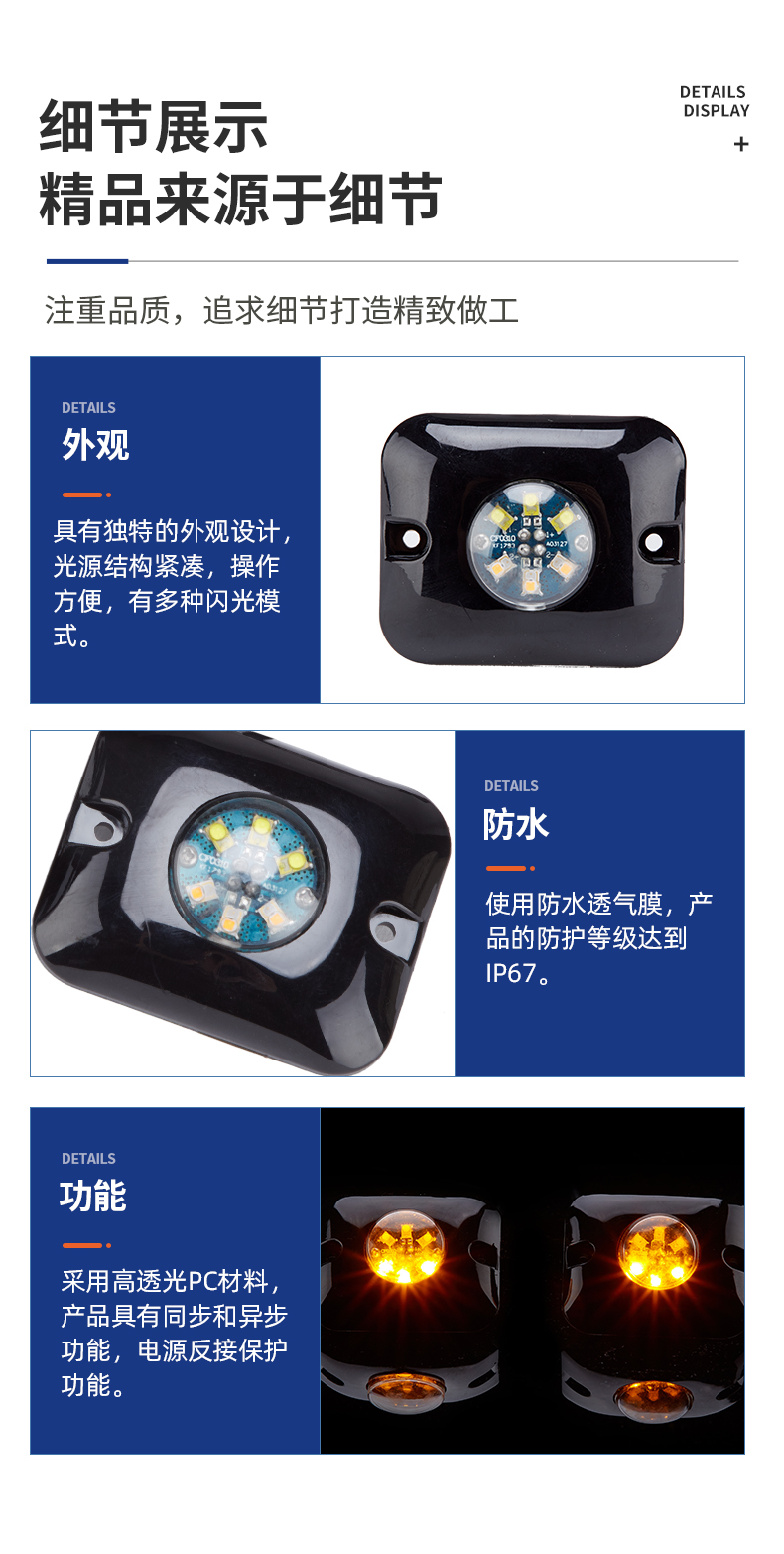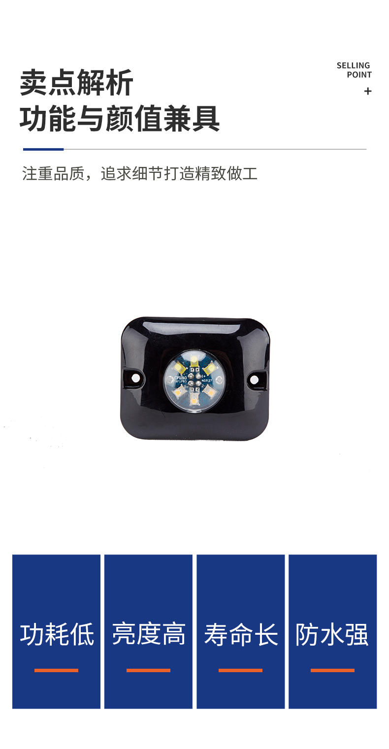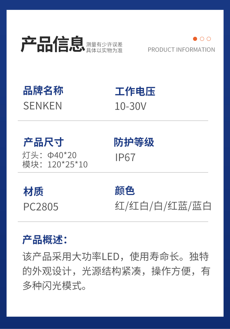 该产品采用大功率LED,使用寿命长。独特的外观设计,光源结构紧凑,操作方便,有多种闪光模式。