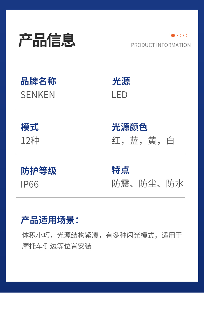 该产品采用大功率LED,使用寿命长。独特的外观设计,光源结构紧凑,操作方便,有多种闪光模式。
