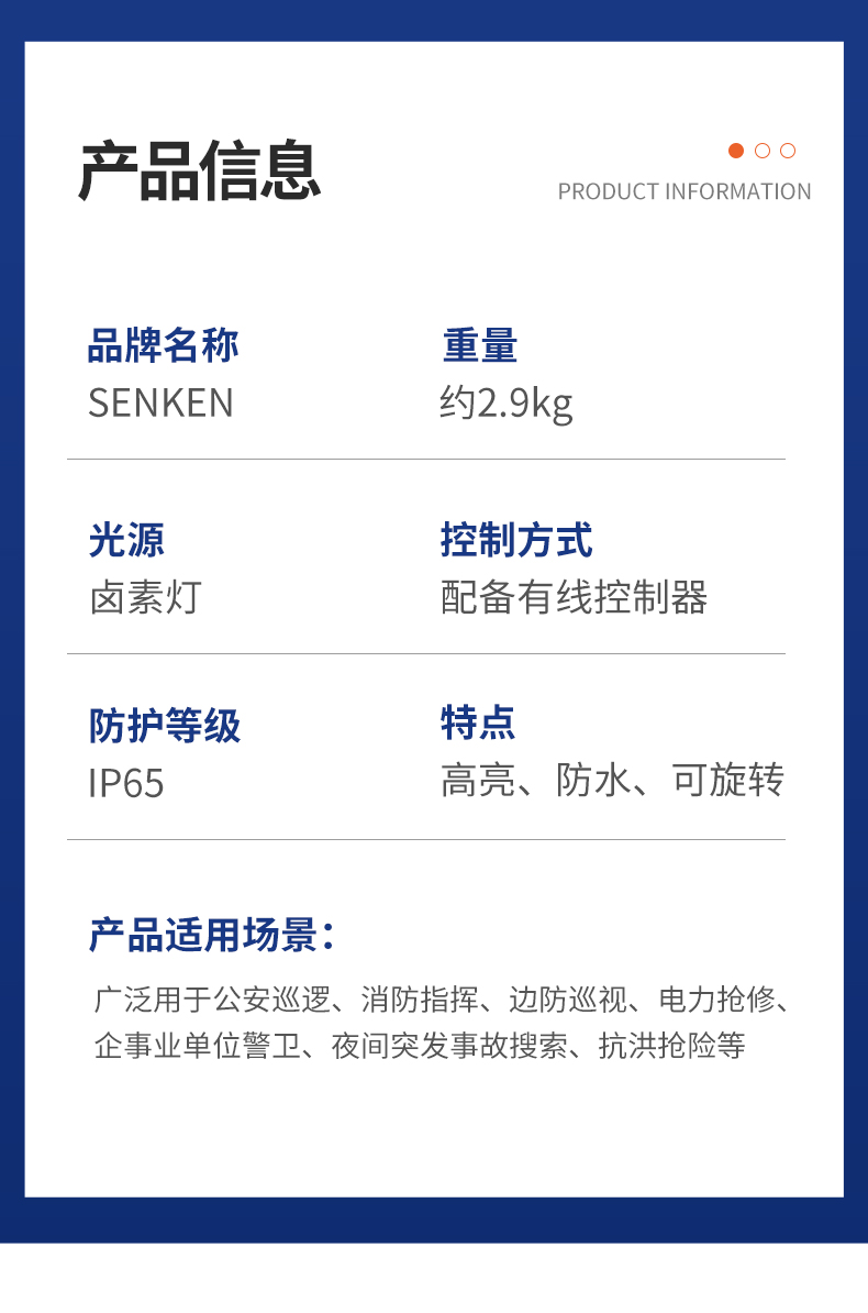 YTLVI05-70搜索灯采用优化设计,以卤素灯为光源,并结合高亮强反光聚光设计,发光更高效,广泛用于公安巡逻、消防指挥、电力抢修、企事业单位警卫、夜间突发事故搜索、抗洪抢险等照明使用。