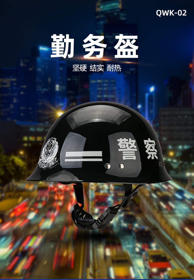 QWK-02勤务盔是一种用于防止头部及面部受到打击或其他潜在的伤害性攻击的警用装具。本头盔采用高强度ABS和PC材料制造,头盔由壳体、缓冲层、佩戴装置等组成,具有线条流畅,视野宽阔,透光率好,佩戴牢靠、舒适、解脱方便等特点,符合《GA296-2001警用勤务头盔》标准的规定。是警务人员在日常执勤巡逻中保障自身的必备防护装备。