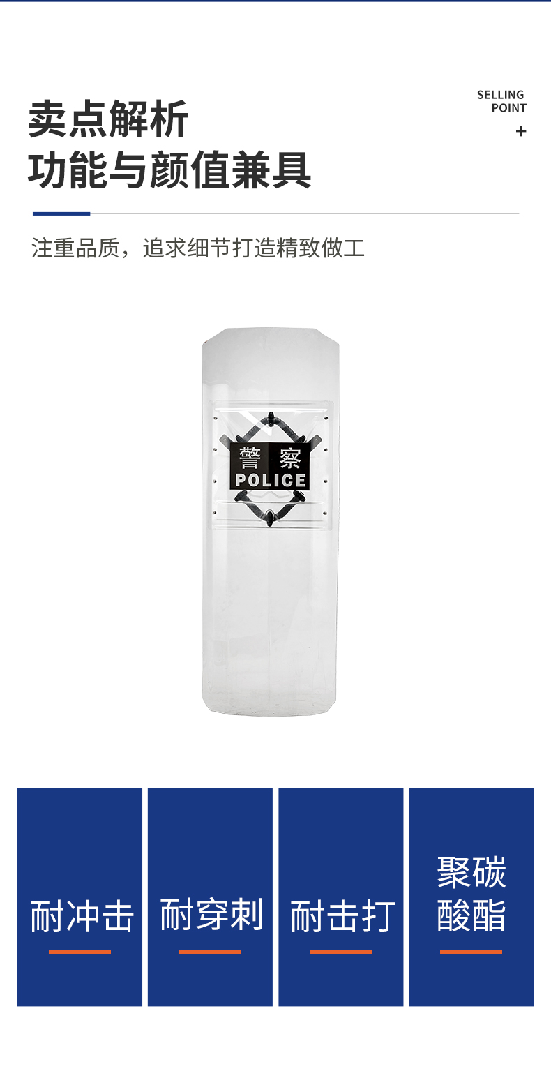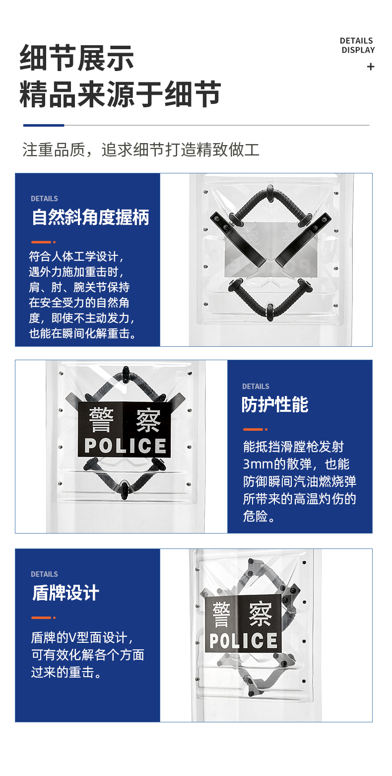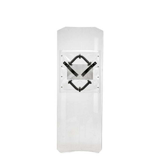 新一代防暴盾牌采用耐用的聚碳酸酯制成,通过综合提高性能和设计,在持续的暴力冲击过程中,能抵挡滑膛枪发射3mm的散弹,也能防御瞬间汽油燃烧弹所带来的高温灼伤的危险,筑起安全防护的持久防线。同时,盾牌背部的加强板可有效降低双手的冲击与振动,盾牌的V型面设计亦可有效化解各个方面过来的重击。