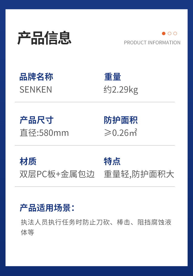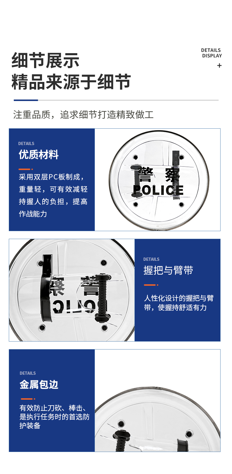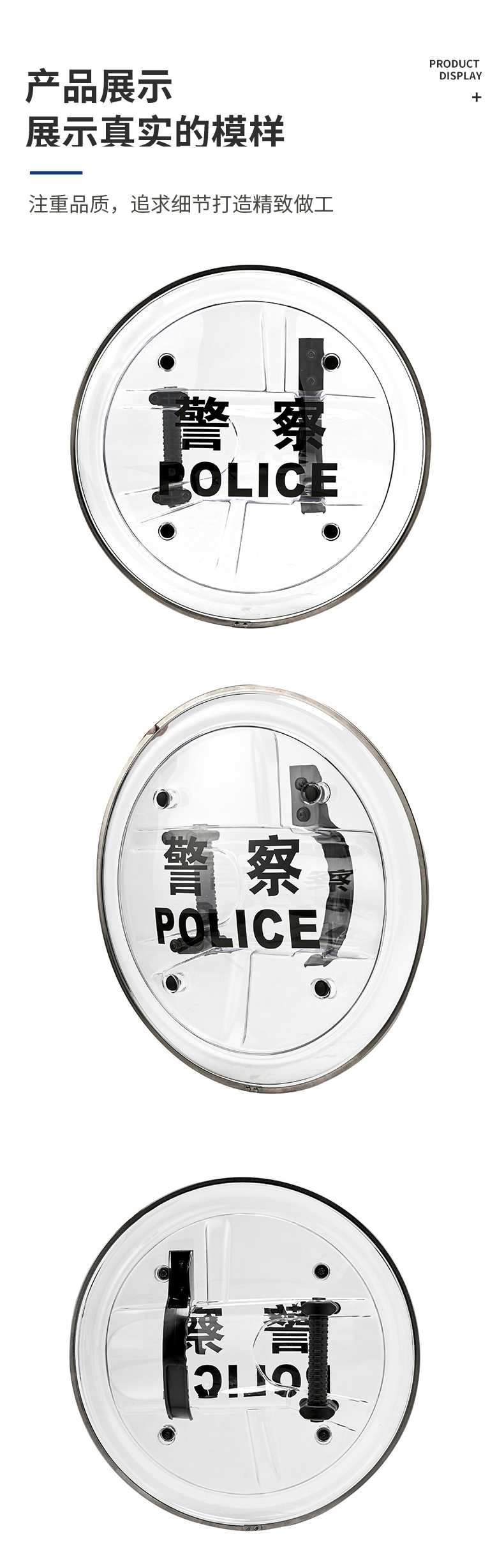 本盾牌采用双层PC板制成,周边有金属包边;有效防止刀砍、棒击、阻挡腐蚀液体等,是执法人员执行任务时的防护装备;人性化设计的握把与臂带,使握持舒适有力;重量轻,可有效减轻持握人的负担,提高作战能力;防护面积大,可以有效的保障盾体之后人员安全。