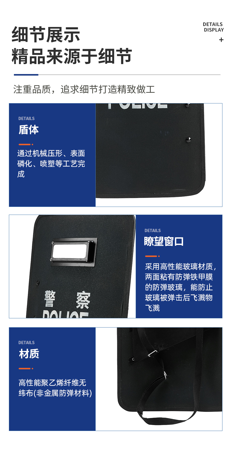盾体通过机械压形、表面磷化、喷塑等工艺完成,盾牌上的瞭望窗口采用高性能玻璃材质,两面粘有防弹铁甲膜的防弹玻璃,能防止玻璃被弹击后飞溅物飞溅,更有效的防护自身安全。