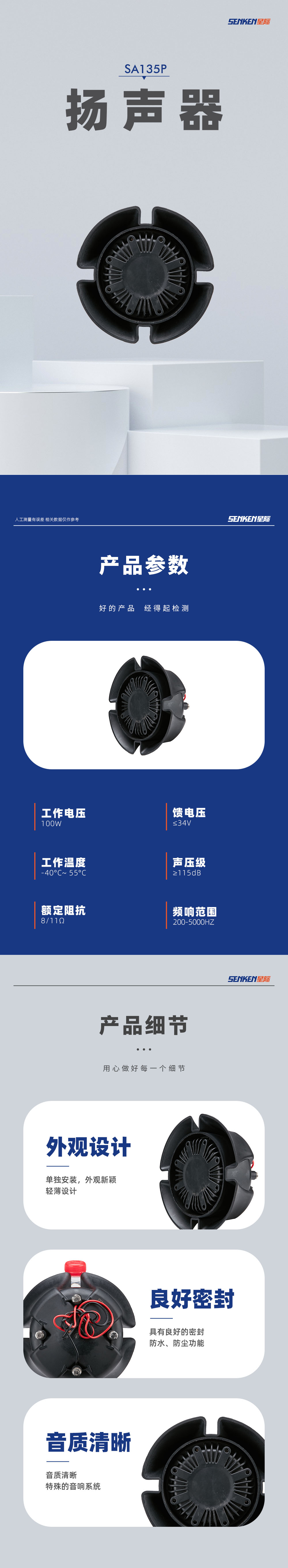 SA135P扬声器是一种新开发的超薄产品。它可以单独安装,外观新颖,音质清晰,和特殊的音响系统。具有良好的密封、防水、防尘功能。
