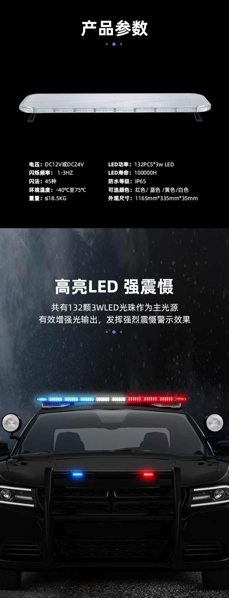 TBD700000系列长排警示灯是我公司自主设计开发的中高端产品,充分考虑运动学和力学的需要,达到与车的完美结合,整体效果充分显示了警车的威严与庄重。 该产品也是采用了节能环保又高效率的高亮度LED做为主光源,及公司高亮度LED灯部件,发挥了强烈的震慑警示效果。该产品的光学设计满足R65,SAE,GB13954,这就使长灯的整体效果和档次大幅度提升,实现成功升级转型。是目前国内中高档警示产品。