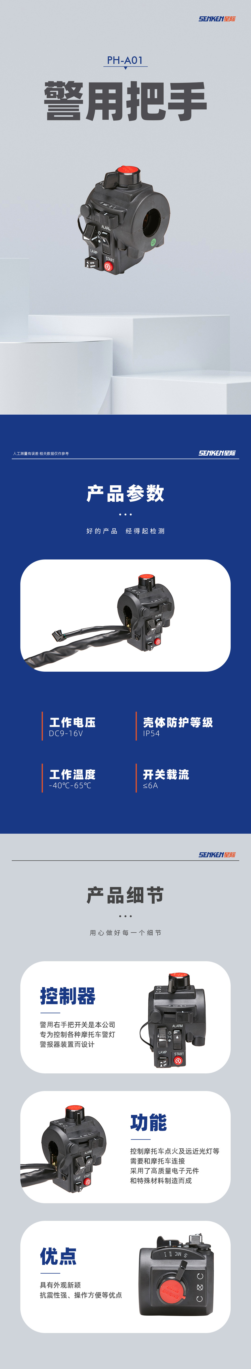 一体式手把专为控制各种摩托车警灯、警报器装置而设计,采用了高质量电子元件和特殊材料制造而成,具有外观新颖、抗震性强、操作方便等优点。被广泛应用于特种警用摩托车作配套使用。