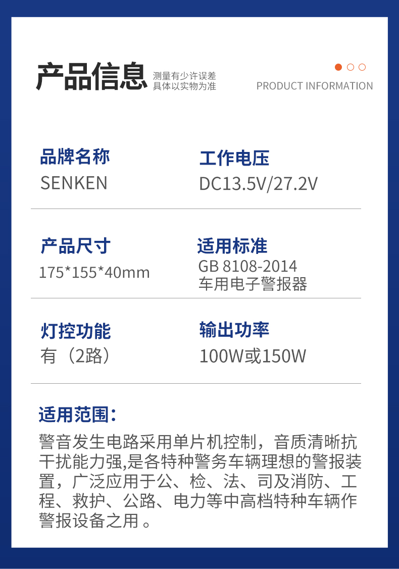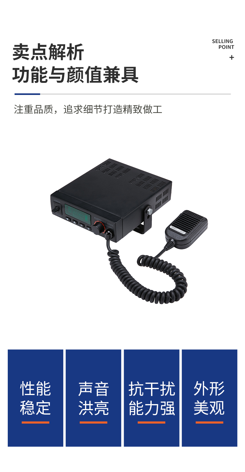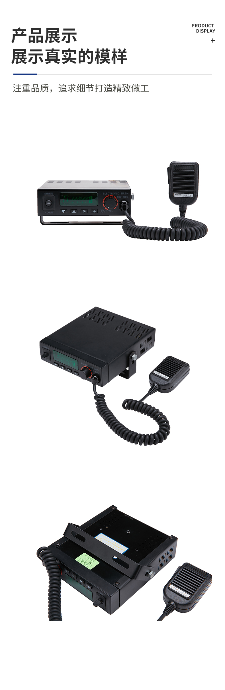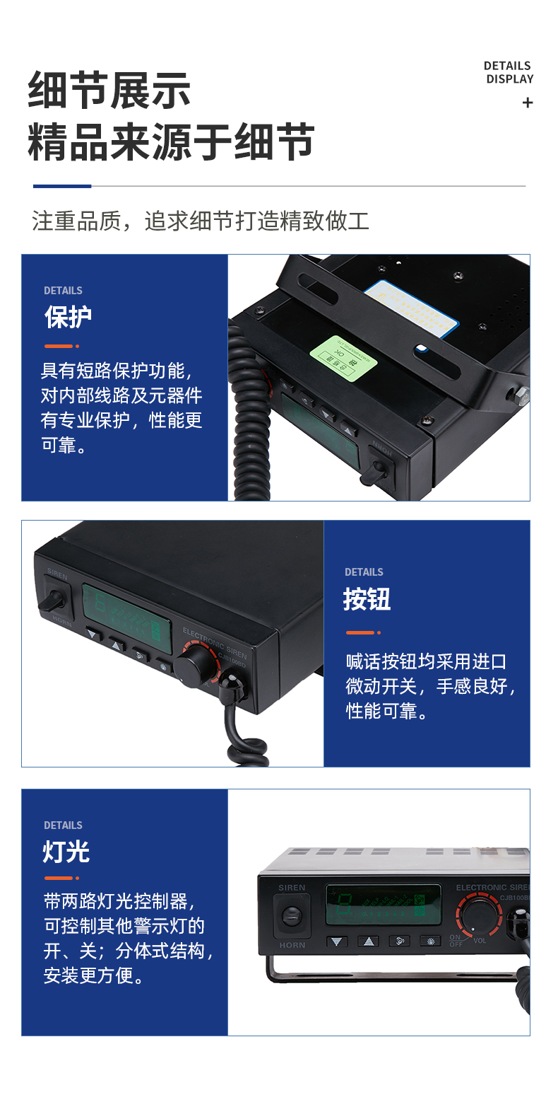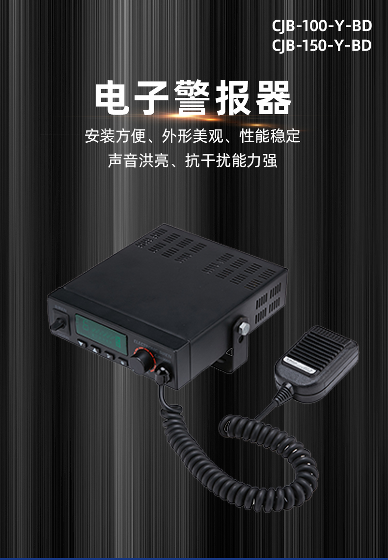 CJB-100-Y-BD电子警报器是采用超薄流线型外观设计,面板采用LED背光指示功能,且警音选择由数码管显示来指示,便于夜间操作。警音发生电路采用单片机控制,音质清晰抗干扰能力强,是各特种警务车辆理想的警报装置,广泛应用于公、检、法、司及消防、工程、救护、公路、电力等中高档特种车辆作警报设备之用 。