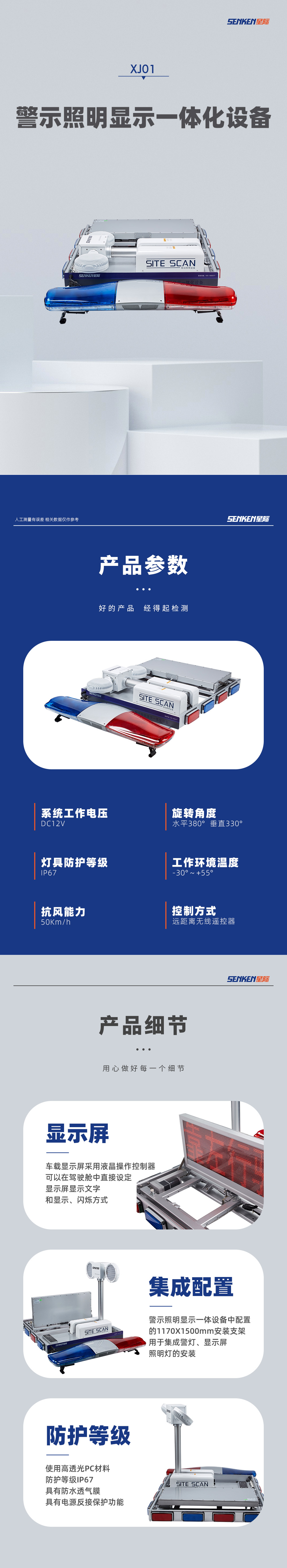 警示照明显示一体化设备是将升降式车载移动照明设备、长排警灯、车载消息显示屏、集成控制系统以及全周警示灯进行有机组合的一套多功能系统。它具备照明、灯光警示、声音警示、文字警示和发布、喊话、扩音、收音机、录音等多种功能。