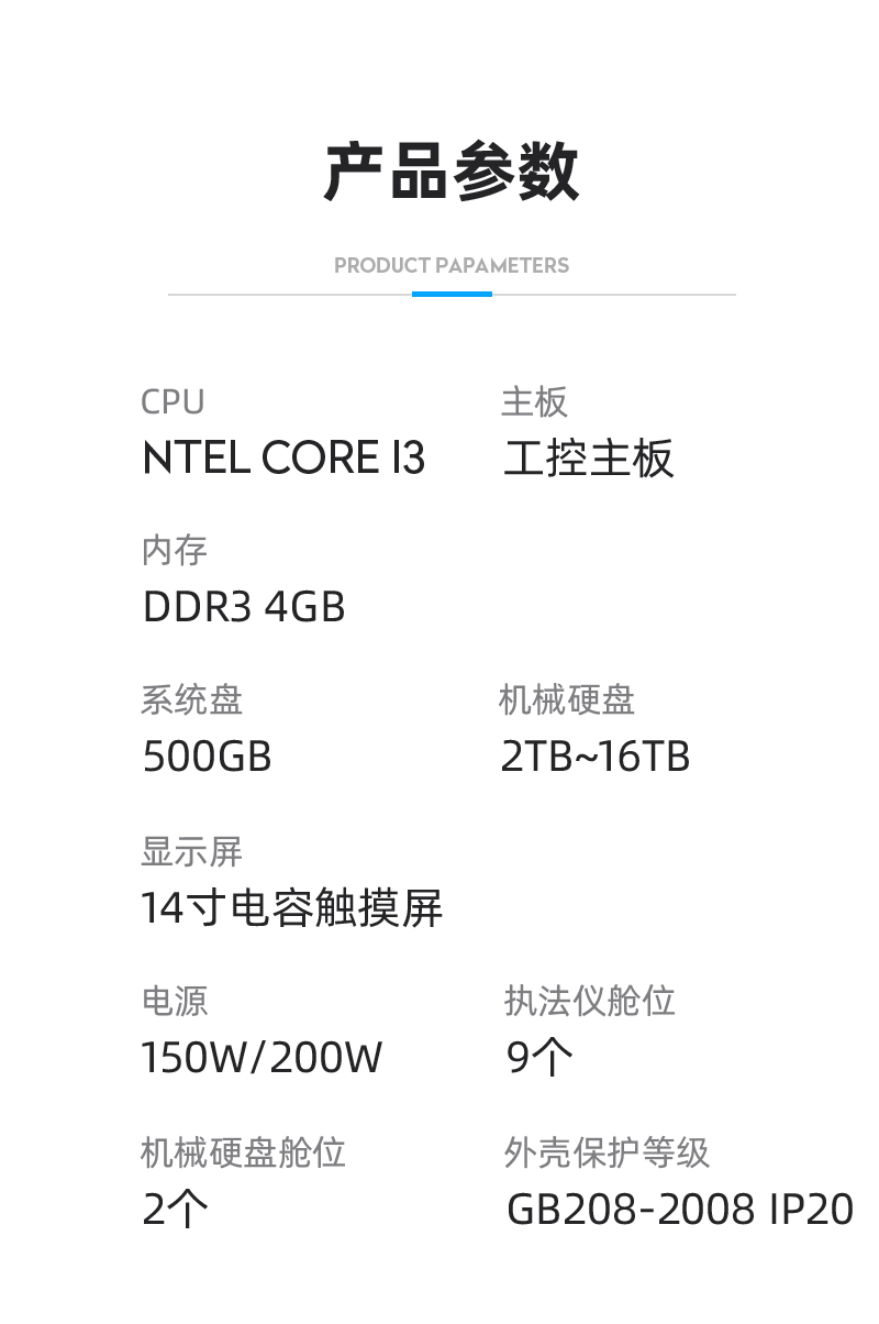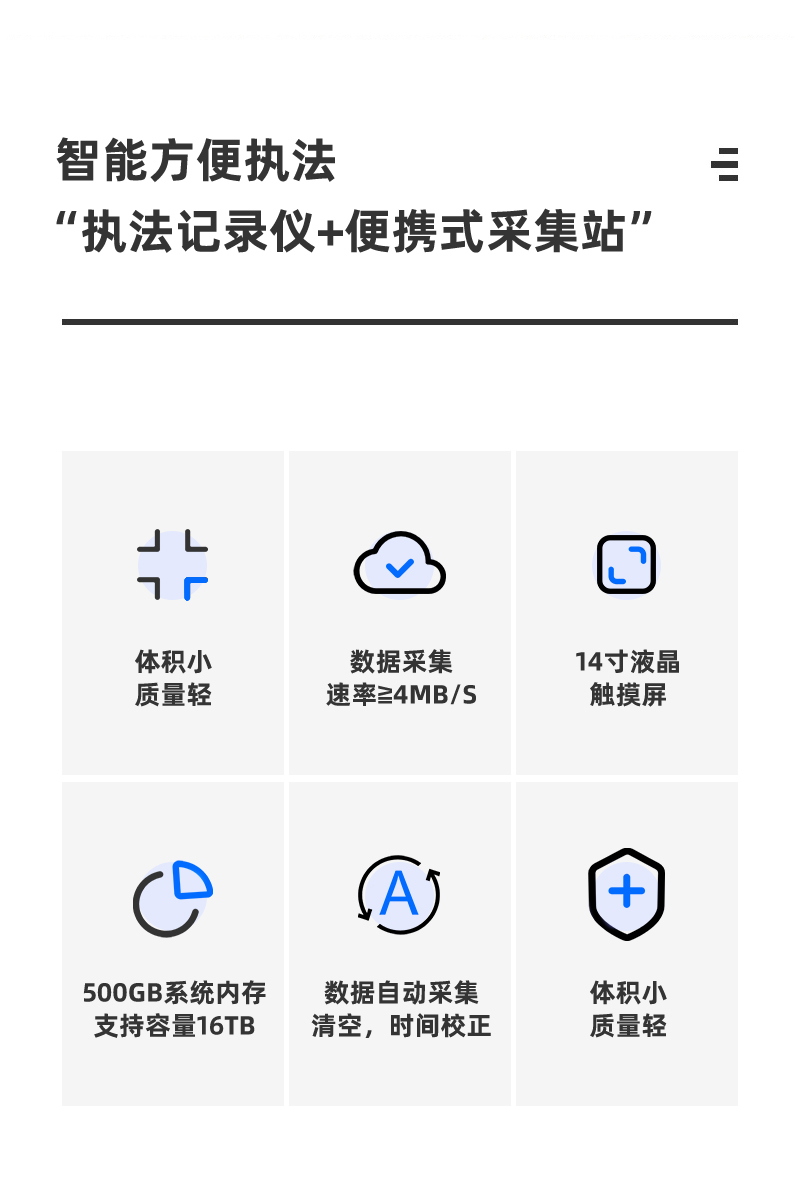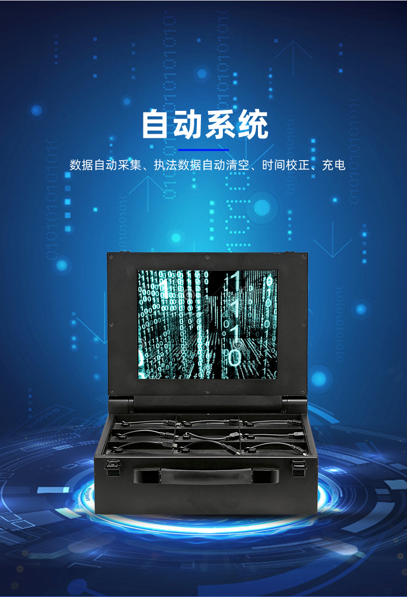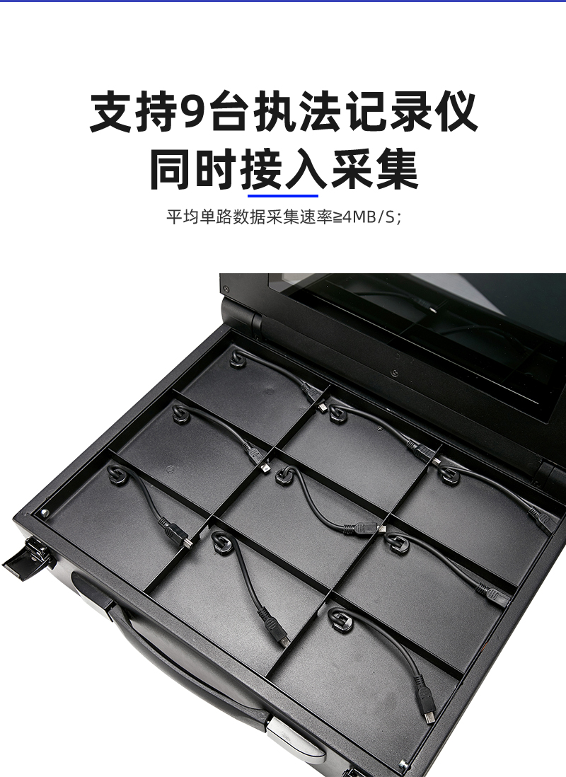 本产品具备体积小、质量轻、大容量、移动便携、14寸大屏显示等优势,支持9台执法记录仪同时接入,平均采集速率≥4MB/S,实现数据自动采集、自动清空、集中管理等功能,适用于各警局、派出所、交警队、路政局、海事局、城市管理局、铁路部门等一线执法部门。